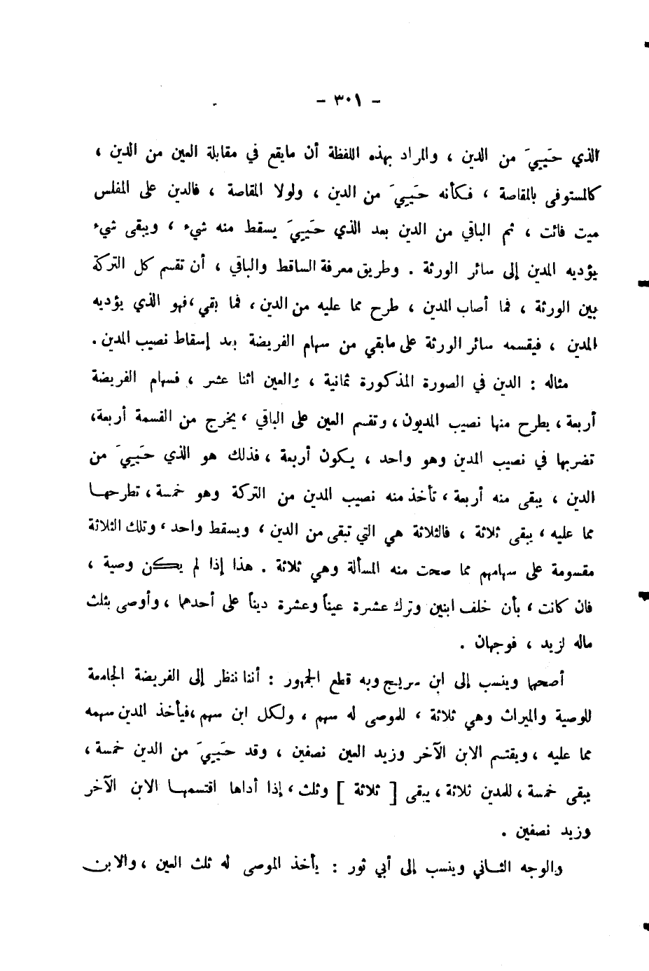 مِثَالُهُ: الدَّيْنُ فِي الصُّورَةِ الْمَذْكُورَةِ ثَمَانِيَةٌ، وَالْعَيْنُ اثْنَا عَشَرَ، فَسِهَامُ الْفَرِيضَةِ أَرْبَعَةٌ، يُطْرَحُ مِنْهَا نَصِيبُ الْمَدْيُونِ، وَتُقَسَّمُ الْعَيْنُ عَلَى الْبَاقِي، يَخْرُجُ مِنَ الْقِسْمَةِ أَرْبَعَةٌ، تَضْرِبُهَا فِي نَصِيبِ الْمَدِينِ وَهُوَ وَاحِدٌ، يَكُونُ أَرْبَعَةٌ، فَذَلِكَ هُوَ الَّذِي حَيِيَ مِنَ الدَّيْنِ، يَبْقَى مِنْهُ أَرْبَعَةٌ، تَأْخُذُ مِنْهُ نَصِيبَ الْمَدِينِ مِنَ التَّرِكَةِ وَهُوَ خَمْسَةٌ، تَطْرَحُهَا مِمَّا عَلَيْهِ، يَبْقَى ثَلَاثَةٌ، فَالثَّلَاثَةُ هِيَ الَّتِي تَبْقَى مِنَ الدَّيْنِ، وَيَسْقُطُ وَاحِدٌ، وَتِلْكَ الثَّلَاثَةُ مَقْسُومَةٌ عَلَى سِهَامِهِمْ مِمَّا صَحَّتْ مِنْهُ الْمَسْأَلَةُ وَهِيَ ثَلَاثَةٌ. هَذَا إِذَا لَمْ يَكُنْ وَصِيَّةٌ، فَإِنْ كَانَتْ، بِأَنْ خَلَفَ ابْنَيْنِ وَتَرَكَ عَشَرَةً عَيْنًا، وَعَشَرَةً دَيْنًا عَلَى أَحَدِهِمَا، وَأَوْصَى بِثُلُثِ مَالِهِ لِزَيْدٍ، فَوَجْهَانِ: