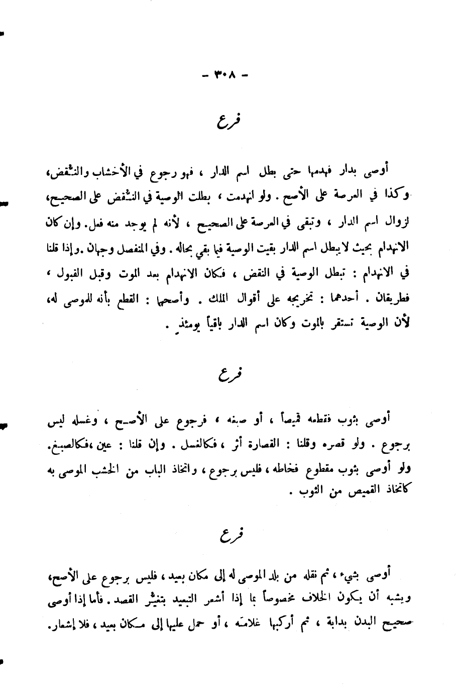أَوْصَى بِدَارٍ فَهَدَمَهَا حَتَّى بَطَلَ اسْمُ الدَّارِ، فَهُوَ رُجُوعٌ فِي الْأَخْشَابِ وَالنَّقْضِ، وَكَذَا فِي الْعَرْصَةِ عَلَى الْأَصَحِّ. وَلَوِ انْهَدَمَتْ بَطَلَتِ الْوَصِيَّةُ فِي النَّقْضِ عَلَى الصَّحِيحِ، لِزَوَالِ اسْمِ الدَّارِ، وَتَبْقَى فِي الْعَرْصَةِ عَلَى الصَّحِيحِ، لِأَنَّهُ لَمْ يُوجَدْ مِنْهُ فِعْلٌ. وَإِنْ كَانَ الِانْهِدَامُ بِحَيْثُ لَا يُبْطِلُ اسْمَ الدَّارِ بَقِيَتِ الْوَصِيَّةُ فِيمَا بَقِيَ بِحَالِهِ. وَفِي الْمُنْفَصِلِ وَجْهَانِ. وَإِذَا قُلْنَا فِي الِانْهِدَامِ: تَبْطُلُ الْوَصِيَّةُ فِي النَّقْضِ، فَكَانَ الِانْهِدَامُ بَعْدَ الْمَوْتِ وَقَبْلَ الْقَبُولِ، فَطَرِيقَانِ: أَحَدُهُمَا: تَخْرِيجُهُ عَلَى أَقْوَالِ الْمِلْكِ. وَأَصَحُّهُمَا: الْقَطْعُ بِأَنَّهُ لِلْمُوصَى لَهُ؛ لِأَنَّ الْوَصِيَّةَ تَسْتَقِرُّ بِالْمَوْتِ وَكَانَ اسْمُ الدَّارِ بَاقِيًا يَوْمَئِذٍ.