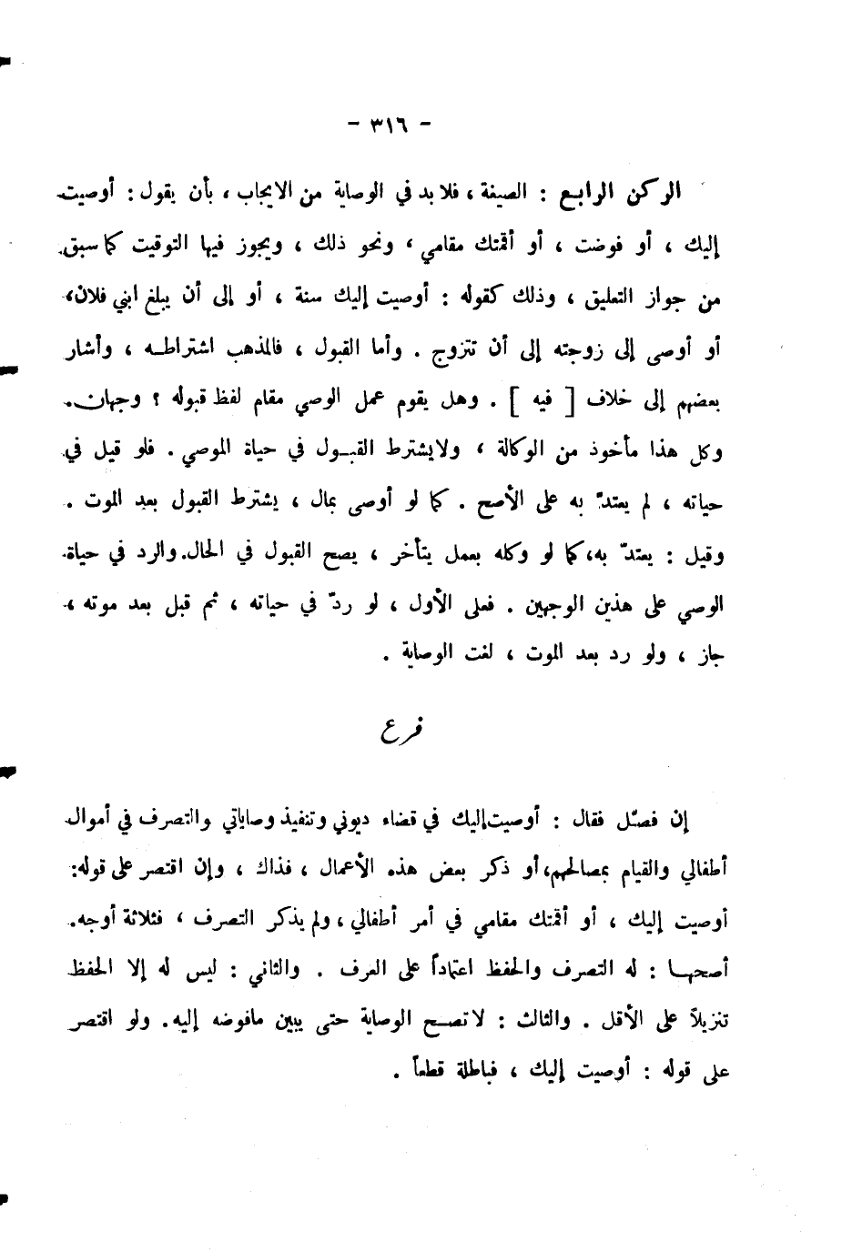 الرُّكْنُ الرَّابِعُ: الصِّيغَةُ، فَلَا بُدَّ فِي الْوِصَايَةِ مِنَ الْإِيجَابِ، بِأَنْ يَقُولَ: أَوْصَيْتُ إِلَيْكَ، أَوْ فَوَّضْتُ، أَوْ أَقَمْتُكَ مَقَامِي، وَنَحْوَ ذَلِكَ، وَيَجُوزُ فِيهَا التَّوْقِيتُ كَمَا سَبَقَ مِنْ جَوَازِ التَّعْلِيقِ، وَذَلِكَ كَقَوْلِهِ: أَوْصَيْتُ إِلَيْكَ سَنَةً، أَوْ إِلَى أَنْ يَبْلُغَ ابْنِي فُلَانٌ، أَوْ أَوْصَى إِلَى زَوْجَتِهِ إِلَى أَنْ تَتَزَوَّجَ.