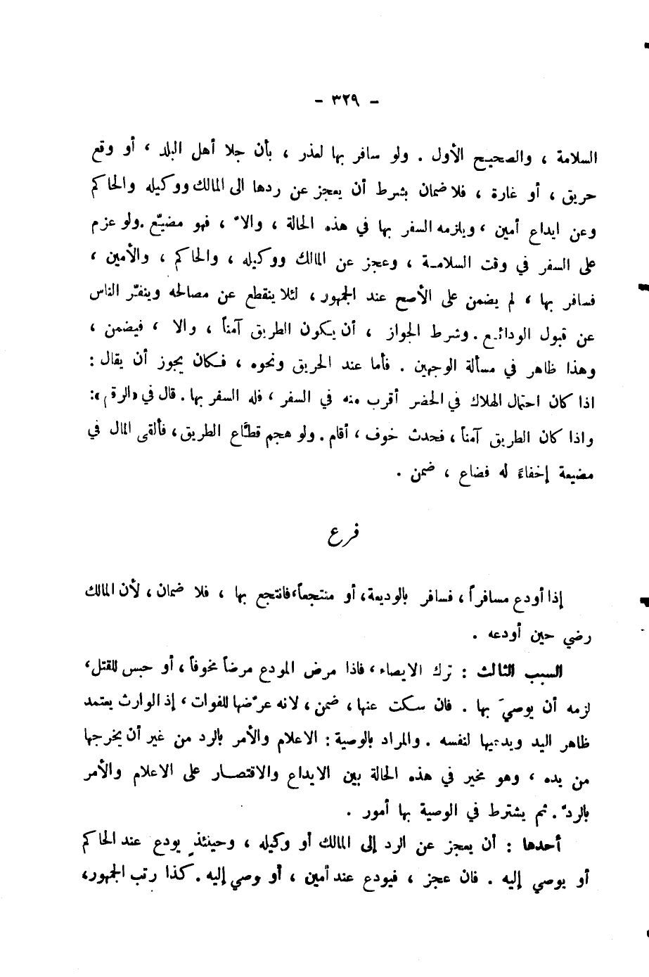 السَّبَبُ الثَّالِثُ: تَرَكَ الْإِيصَاءَ، فَإِذَا مَرِضَ الْمُودَعُ مَرَضًا مَخُوفًا، أَوْ حُبِسَ لِلْقَتْلِ، لَزِمَهُ أَنْ يُوصِيَ بِهَا. فَإِنْ سَكَتَ عَنْهَا، ضَمِنَ؛ لِأَنَّهُ عَرَّضَهَا لِلْفَوَاتِ، إِذِ الْوَارِثُ يَعْتَمِدُ ظَاهِرَ الْيَدِ وَيَدَّعِيهَا لِنَفْسِهِ.