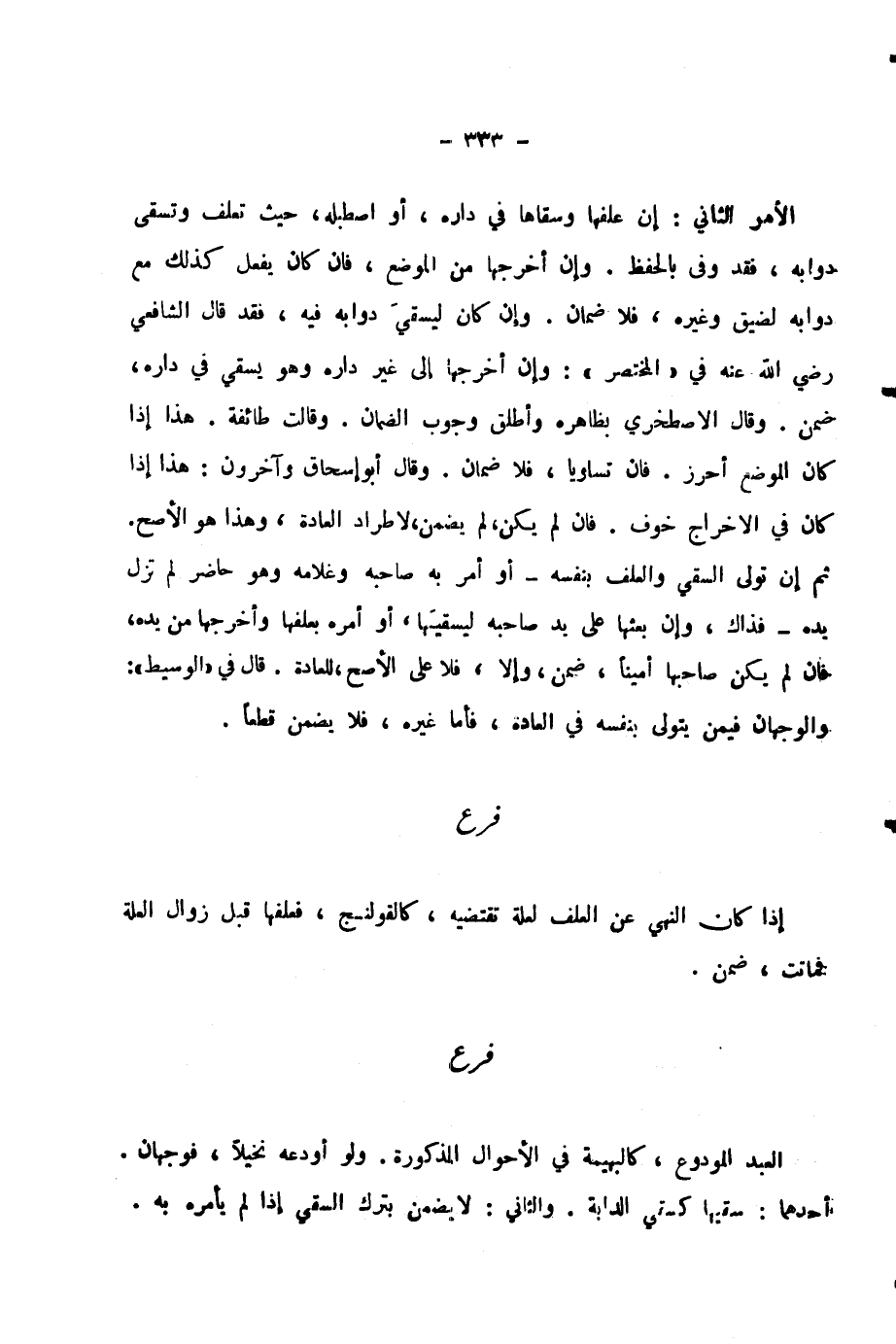 وَقَالَتْ طَائِفَةٌ. هَذَا إِذَا كَانَ الْمَوْضِعُ أَحْرَزَ. فَإِنْ تَسَاوَيَا، فَلَا ضَمَانَ. وَقَالَ أَبُو إِسْحَاقَ وَآخَرُونَ: هَذَا إِذَا كَانَ فِي الْإِخْرَاجِ خَوْفٌ. فَإِنْ لَمْ يَكُنْ، لَمْ يَضْمَنْ، لِاطِّرَادِ الْعَادَةِ، وَهَذَا هُوَ الْأَصَحُّ. ثُمَّ إِنْ تَوَلَّى السَّقْيَ وَالْعَلْفَ بِنَفْسِهِ - أَوْ أَمَرَ بِهِ صَاحِبَهُ وَغُلَامَهُ وَهُوَ حَاضِرٌ لَمْ تَزُلْ يَدُهُ - فَذَاكَ، وَإِنْ بَعَثَهَا عَلَى يَدِ صَاحِبِهِ لِيَسْقِيَهَا، أَوْ أَمَرَهُ بِعَلْفِهَا وَأَخْرَجَهَا مِنْ يَدِهِ، فَإِنْ لَمْ يَكُنْ صَاحِبُهَا أَمِينًا، ضَمِنَ، وَإِلَّا فَلَا عَلَى الْأَصَحِّ، لِلْعَادَةِ. قَالَ فِي ((الْوَسِيطِ)) : وَالْوَجْهَانِ فِيمَنْ يَتَوَلَّى بِنَفْسِهِ فِي الْعَادَةِ، فَأَمَّا غَيْرُهُ، فَلَا يَضْمَنُ قَطْعًا.