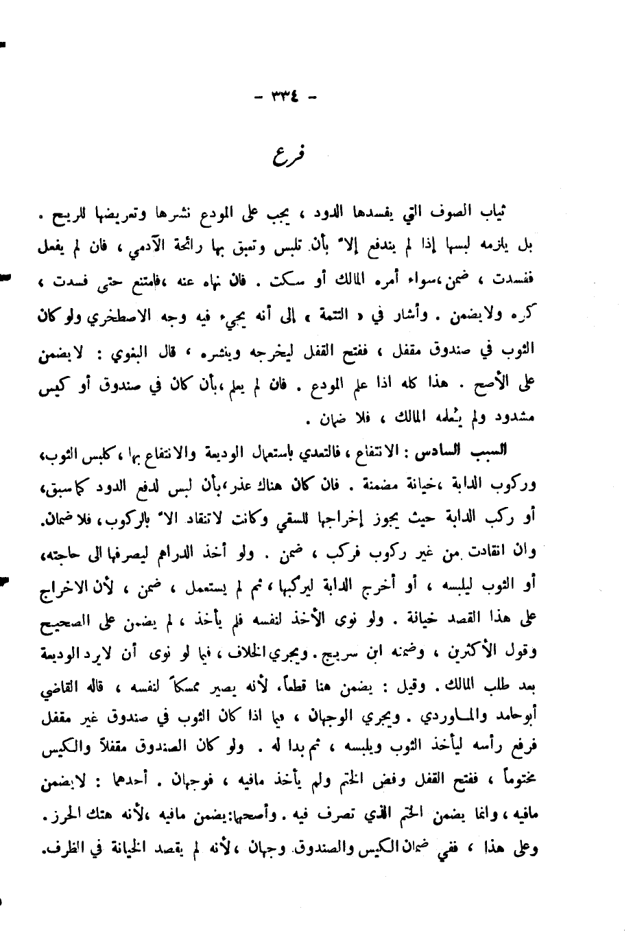 السَّبَبُ السَّادِسُ: الِانْتِفَاعُ. فَالتَّعَدِّي بِاسْتِعْمَالِ الْوَدِيعَةِ وَالِانْتِفَاعِ بِهَا، كَلُبْسِ الثَّوْبِ، وَرُكُوبِ الدَّابَّةِ، خِيَانَةٌ مُضَمَّنَةٌ. فَإِنْ كَانَ هُنَاكَ عُذْرٌ، بِأَنْ لَبِسَ لِدَفْعِ الدُّودِ كَمَا سَبَقَ، أَوْ رَكِبَ الدَّابَّةَ حَيْثُ يَجُوزُ إِخْرَاجُهَا لِلسَّقْيِ وَكَانَتْ لَا تَنْقَادُ إِلَّا بِالرُّكُوبِ، فَلَا ضَمَانَ. وَإِنِ انْقَادَتْ مِنْ غَيْرِ رُكُوبٍ فَرَكِبَ، ضَمِنَ. وَلَوْ أَخَذَ الدَّرَاهِمَ لِيَصْرِفَهَا إِلَى حَاجَتِهِ، أَوِ الثَّوْبَ لِيَلْبَسَهُ، أَوْ أَخْرَجَ الدَّابَّةَ لِيَرْكَبَهَا، ثُمَّ لَمْ يَسْتَعْمِلْ، ضَمِنَ؛ لِأَنَّ الْإِخْرَاجَ عَلَى هَذَا الْقَصْدِ خِيَانَةٌ.