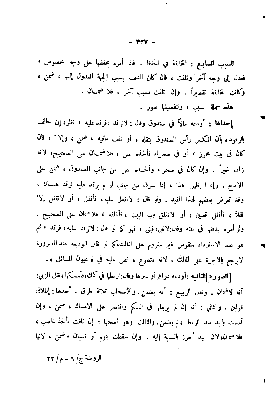 السَّبَبُ السَّابِعُ: الْمُخَالَفَةُ فِي الْحِفْظِ. فَإِذَا أَمَرَهُ بِحِفْظِهَا عَلَى وَجْهٍ مَخْصُوصٍ، فَعَدَلَ إِلَى وَجْهٍ آخَرَ وَتَلِفَتْ، فَإِنْ كَانَ التَّلَفُ بِسَبَبِ الْجِهَةِ الْمَعْدُولِ إِلَيْهَا، ضَمِنَ، وَكَانَتِ الْمُخَالَفَةُ تَقْصِيرًا. وَإِنْ تَلِفَتْ بِسَبَبٍ آخَرَ، فَلَا ضَمَانَ.