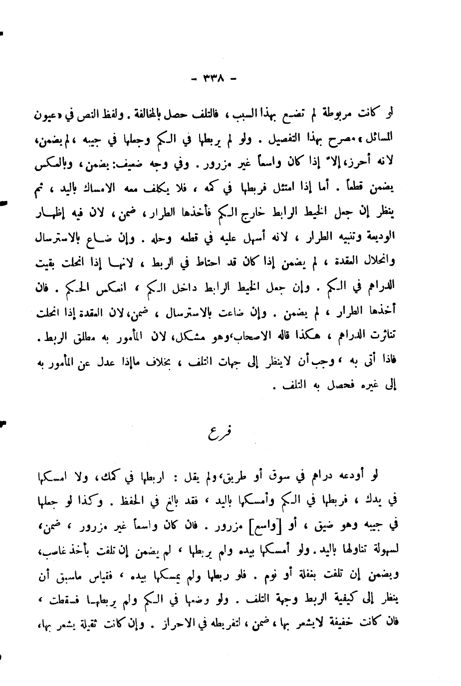 لَوْ كَانَتْ مَرْبُوطَةً لَمْ تَضِعْ بِهَذَا السَّبَبِ، فَالتَّلَفُ حَصَلَ بِالْمُخَالَفَةِ. وَلَفْظُ النَّصِّ فِي ((عُيُونِ الْمَسَائِلِ)) مُصَرِّحٌ بِهَذَا التَّفْصِيلِ. وَلَوْ لَمْ يَرْبِطْهَا فِي الْكُمِّ وَجَعَلَهَا فِي جَيْبِهِ، لَمْ يَضْمَنْ؛ لِأَنَّهُ أَحْرَزُ، إِلَّا إِذَا كَانَ وَاسِعًا غَيْرَ مَزْرُورٍ. وَفِي وَجْهٍ ضَعِيفٍ: يَضْمَنُ، وَبِالْعَكْسِ يَضْمَنُ قَطْعًا. أَمَّا إِذَا امْتَثَلَ فَرَبَطَهَا فِي كُمِّهِ، فَلَا يُكَلَّفُ مَعَهُ الْإِمْسَاكَ بِالْيَدِ، ثُمَّ يُنْظَرُ إِنْ جَعَلَ الْخَيْطَ الرَّابِطَ خَارِجَ الْكُمِّ فَأَخَذَهَا الطَّرَّارُ، ضَمِنَ؛ لِأَنَّ فِيهِ إِظْهَارَ الْوَدِيعَةِ وَتَنْبِيهَ الطَّرَّارِ؛ لِأَنَّهُ أَسْهَلُ عَلَيْهِ فِي قَطْعِهِ وَحَلِّهِ. وَإِنْ ضَاعَ بِالِاسْتِرْسَالِ وَانْحِلَالِ الْعُقْدَةِ، لَمْ يَضْمَنْ إِذَا كَانَ قَدِ احْتَاطَ فِي الرَّبْطِ؛ لِأَنَّهَا إِذَا انْحَلَّتْ بَقِيَتِ الدَّرَاهِمُ فِي الْكُمِّ.