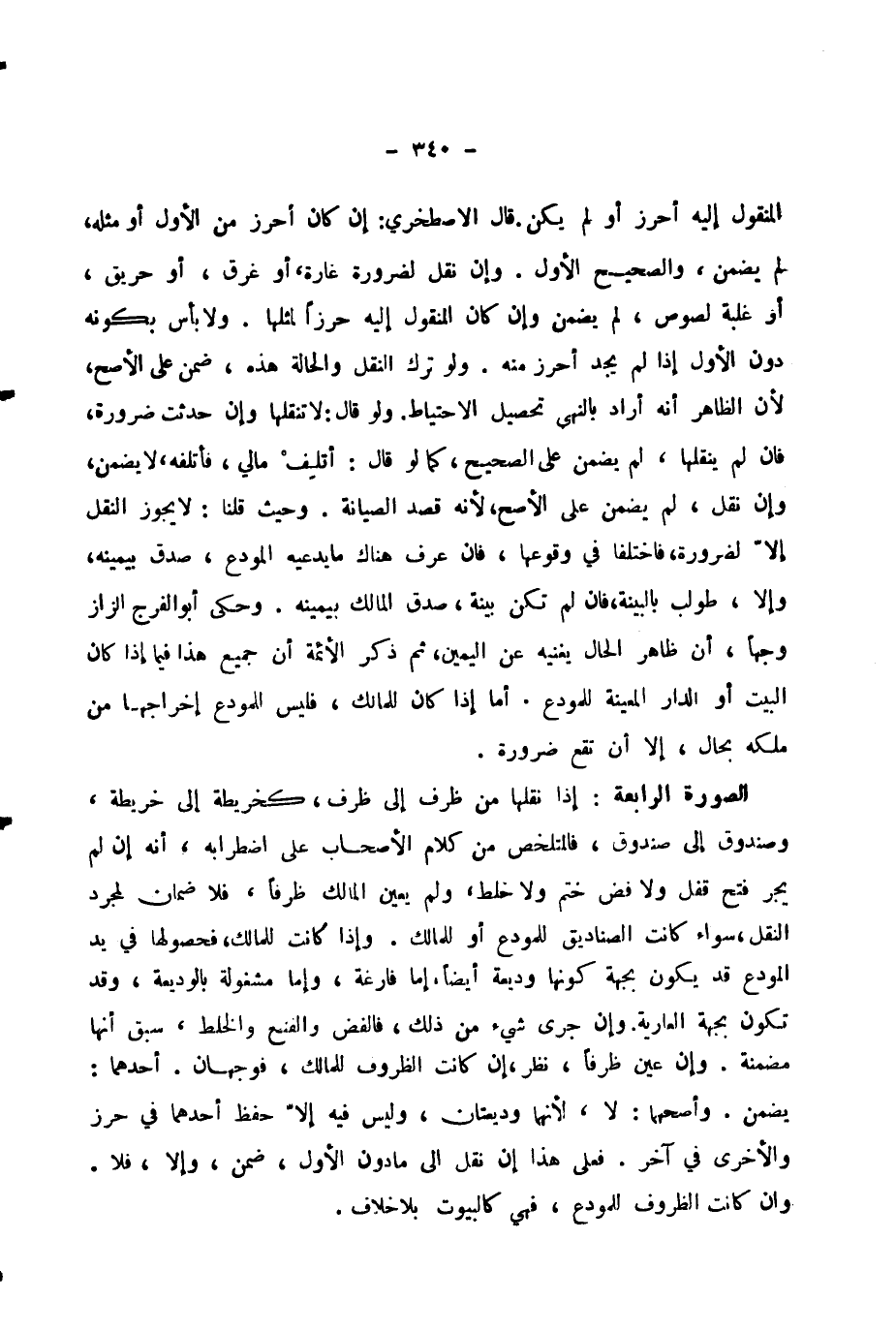 الصُّورَةُ الرَّابِعَةُ: إِذَا نَقَلَهَا مِنْ ظَرْفٍ إِلَى ظَرْفٍ، كَخَرِيطَةٍ إِلَى خَرِيطَةٍ، وَصُنْدُوقٍ إِلَى صُنْدُوقٍ، فَالْمُتَلَخِّصُ مِنْ كَلَامِ الْأَصْحَابِ عَلَى اضْطِرَابِهِ، أَنَّهُ إِنْ لَمْ يَجْرِ فَتْحُ قُفْلٍ وَلَا فَضُّ خَتْمٍ وَلَا خَلْطٌ، وَلَمْ يُعَيِّنِ الْمَالِكُ ظَرْفًا، فَلَا ضَمَانَ لِمُجَرَّدِ النَّقْلِ، سَوَاءٌ كَانَتِ الصَّنَادِيقُ لِلْمُودَعِ أَوْ لِلْمَالِكِ. وَإِذَا كَانَتْ لِلْمَالِكِ، فَحُصُولُهَا فِي يَدِ الْمُودَعِ قَدْ يَكُونُ بِجِهَةِ كَوْنِهَا وَدِيعَةً أَيْضًا. إِمَّا فَارِغَةً، وَإِمَّا مَشْغُولَةً بِالْوَدِيعَةِ، وَقَدْ تَكُونُ بِجِهَةِ الْعَارِيَةِ. وَإِنْ جَرَى شَيْءٌ مِنْ ذَلِكَ، فَالْفَضُّ وَالْفَتْحُ وَالْخَلْطُ سَبَقَ أَنَّهَا مُضَمَّنَةٌ. وَإِنْ عَيَّنَ ظَرْفًا، نُظِرَ، إِنْ كَانَتِ الظُّرُوفُ لِلْمَالِكِ، فَوَجْهَانِ. أَحَدُهُمَا: يَضْمَنُ. وَأَصَحُّهُمَا: لَا لِأَنَّهُمَا وَدِيعَتَانِ، وَلَيْسَ فِيهِ إِلَّا حِفْظُ أَحَدِهِمَا فِي حِرْزٍ وَالْأُخْرَى فِي آخَرَ. فَعَلَى هَذَا إِنْ نَقَلَ إِلَى مَا دُونَ الْأَوَّلِ، ضَمِنَ، وَإِلَّا، فَلَا. وَإِنْ كَانَتِ الظُّرُوفُ لِلْمُودَعِ، فَهِيَ كَالْبُيُوتِ بِلَا خِلَافٍ.