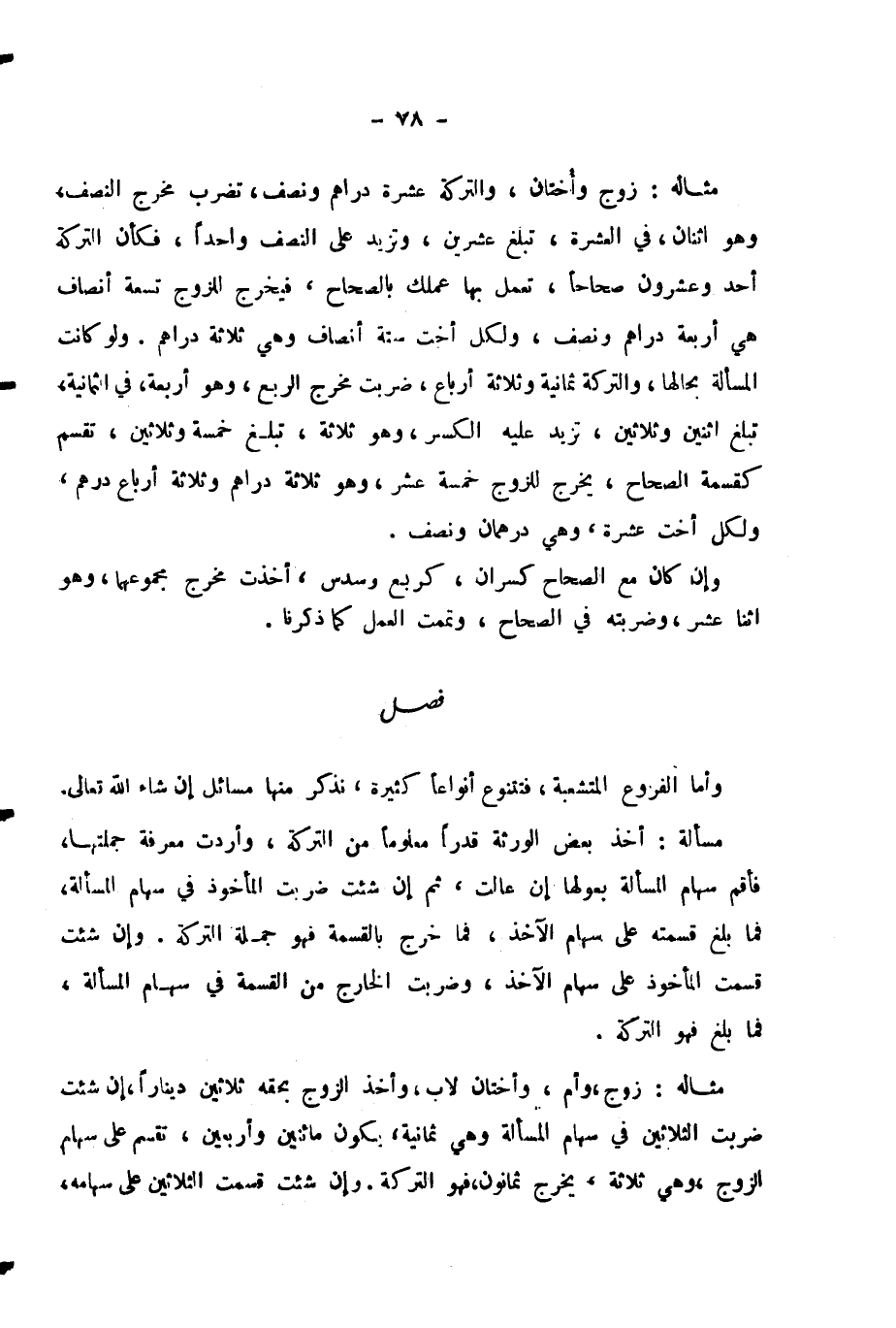 وَأَمَّا الْفُرُوعُ الْمُتَشَعِّبَةُ، فَتَتَنَوَّعُ أَنْوَاعًا كَثِيرَةً، نَذْكُرُ مِنْهَا مَسَائِلَ - إِنْ شَاءَ اللَّهُ تَعَالَى -. مَسْأَلَةٌ: أَخَذَ بَعْضُ الْوَرَثَةِ قَدْرًا مَعْلُومًا مِنَ التَّرِكَةِ، وَأَرَدْتَ مَعْرِفَةَ جُمْلَتِهَا، فَأَقِمْ سِهَامَ الْمَسْأَلَةِ بِعَوْلِهَا إِنْ عَالَتْ، ثُمَّ إِنْ شِئْتَ ضَرَبْتَ الْمَأْخُوذَ فِي سِهَامِ الْمَسْأَلَةِ فَمَا بَلَغَ قَسَمْتَهُ عَلَى سِهَامِ الْآخِذِ، فَمَا خَرَجَ بِالْقِسْمَةِ فَهُوَ جُمْلَةُ التَّرِكَةِ. وَإِنْ شِئْتَ قَسَمْتَ الْمَأْخُوذَ عَلَى سِهَامِ الْآخِذِ، وَضَرَبْتَ الْخَارِجَ مِنَ الْقِسْمَةِ فِي سِهَامِ الْمَسْأَلَةِ، فَمَا بَلَغَ فَهُوَ التَّرِكَةُ.