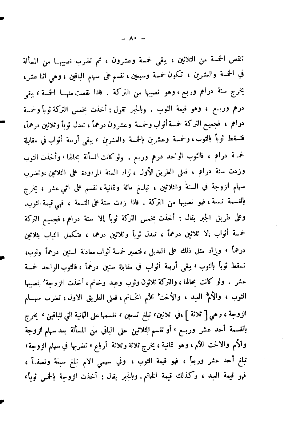 تَنْقُصُ الْخَمْسَةُ مِنَ الثَّلَاثِينَ، يَبْقَى خَمْسَةٌ وَعِشْرُونَ، ثُمَّ تَضْرِبُ نَصِيبَهَا مِنَ الْمَسْأَلَةِ فِي الْخَمْسَةِ وَالْعِشْرِينَ، تَكُونُ خَمْسَةً وَسَبْعِينَ، تُقْسَمُ عَلَى سِهَامِ الْبَاقِينَ، وَهِيَ اثْنَا عَشَرَ، يَخْرُجُ سِتَّةُ دَرَاهِمَ وَرُبُعٌ، وَهُوَ نَصِيبُهَا مِنَ التَّرِكَةِ. فَإِذَا نَقَصَتْ مِنْهَا الْخَمْسَةُ، يَبْقَى دِرْهَمٌ وَرُبُعٌ، وَهُوَ قِيمَةُ الثَّوْبِ. وَبِالْجَبْرِ تَقُولُ: أَخَذَتْ بِخُمُسِ التَّرِكَةِ ثَوْبًا وَخَمْسَةَ دَرَاهِمَ، فَجَمِيعُ التَّرِكَةِ خَمْسَةُ أَثْوَابٍ وَخَمْسَةٌ وَعِشْرُونَ دِرْهَمًا، تَعْدِلُ ثَوْبًا وَثَلَاثِينَ دِرْهَمًا، فَتُسْقِطُ ثَوْبًا بِالثَّوْبِ، وَخَمْسَةً وَعِشْرِينَ بِالْخَمْسَةِ وَالْعِشْرِينَ، يَبْقَى أَرْبَعَةُ أَثْوَابٍ فِي مُقَابَلَةِ خَمْسَةِ دَرَاهِمَ، فَالثَّوْبُ الْوَاحِدُ دِرْهَمٌ وَرُبُعٌ. وَلَوْ كَانَتِ الْمَسْأَلَةُ بِحَالِهَا، وَأَخَذْتَ الثَّوْبَ وَزِدْتَ سِتَّةَ دَرَاهِمَ، فَعَلَى الطَّرِيقِ الْأَوَّلِ، تُزَادُ السِّتَّةُ الْمَرْدُودَةُ عَلَى الثَّلَاثِينَ، وَتُضْرَبُ سِهَامُ الزَّوْجَةِ فِي السِّتَّةِ وَالثَّلَاثِينَ، تَبْلُغُ مِائَةً وَثَمَانِيَةً، تُقْسَمُ عَلَى اثْنَيْ عَشَرَ، يَخْرُجُ بِالْقِسْمَةِ تِسْعَةٌ، فَهُوَ نَصِيبُهَا مِنَ التَّرِكَةِ. فَإِذَا زِدْتَ سِتَّةً عَلَى التِّسْعَةِ، فَهِيَ قِيمَةُ الثَّوْبِ.