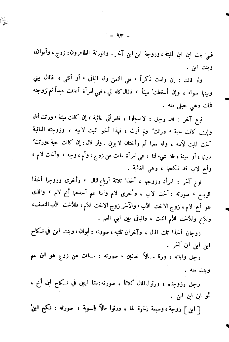 نَوْعٌ آخَرُ: امْرَأَةٌ وَزَوْجُهَا، أَخَذَا ثَلَاثَةَ أَرْبَاعِ الْمَالِ، وَأُخْرَى وَزَوْجُهَا أَخَذَا الرُّبُعَ، صُورَتُهُ: أُخْتٌ لِأَبٍ، وَأُخْرَى لِأُمٍّ وَابْنَا عَمٍّ أَحَدُهُمَا أَخٌ لِأُمٍّ، وَالَّذِي هُوَ أَخٌ لِأُمٍّ، زَوْجُ الْأُخْتِ لِلْأَبِ، وَالْآخِرُ زَوْجُ الْأُخْتِ لِلْأُمِّ، فَلِلْأُخْتِ لِلْأَبِ النِّصْفُ، وَلِلْأَخِ وَلِلْأُخْتِ لِلْأُمِّ الثُّلُثُ، وَالْبَاقِي بَيْنَ ابْنَيِ الْعَمِّ.