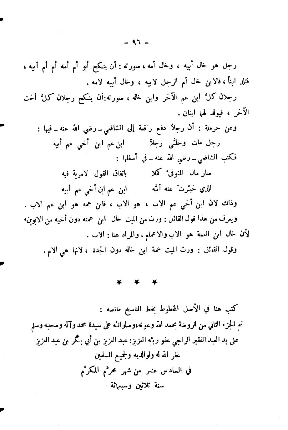 تَمَّ الْجُزْءُ الثَّانِي مِنَ الرَّوْضَةِ بِحَمْدِ اللَّهِ وَعَوْنِهِ وَصَلَوَاتِهِ عَلَى سَيِّدِنَا مُحَمَّدٍ وَآلِهِ وَصَحْبِهِ وَسَلَّمَ عَلَى يَدِ الْعَبْدِ الْفَقِيرِ الرَّاجِي عَفْوَ رَبِّهِ الْعَزِيزِ: عَبْدِ الْعَزِيزِ بْنِ أَبِي بَكْرِ بْنِ عَبْدِ الْعَزِيزِ غَفَرَ اللَّهُ لَهُ وَلِوَالِدَيْهِ وَلِجَمِيعِ الْمُسْلِمِينَ فِي السَّادِسَ عَشَرَ مِنْ شَهْرِ مُحَرَّمٍ الْمُكَرَّمِ سَنَةَ ثَلَاثِينَ وَسَبْعِمِائَةٍ