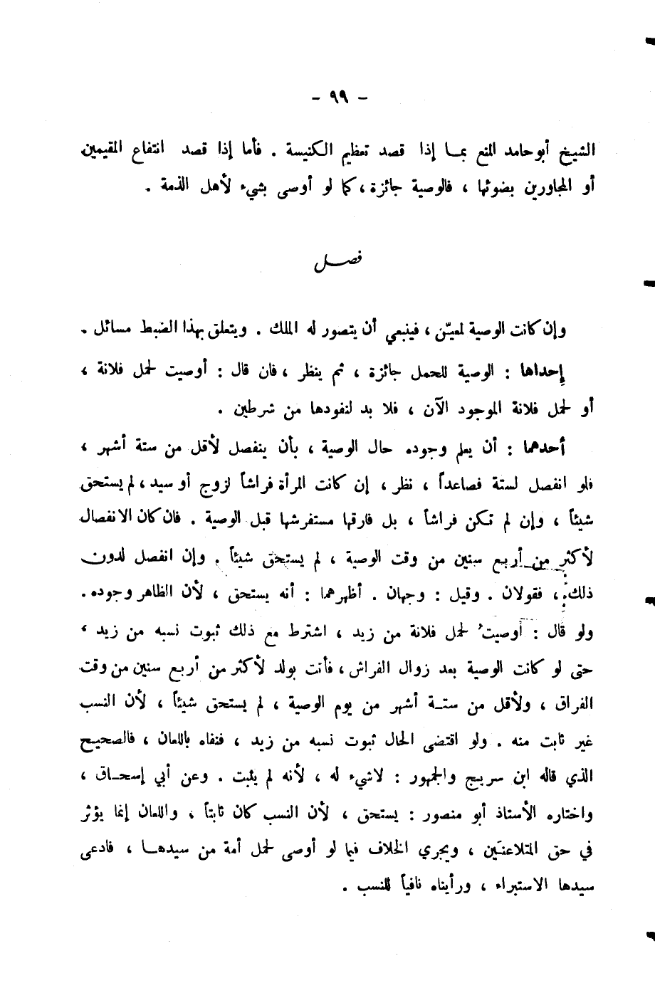 وَإِنْ كَانَتِ الْوَصِيَّةُ لِمُعَيَّنٍ، فَيَنْبَغِي أَنْ يُتَصَوَّرَ لَهُ الْمُلْكُ. وَيَتَعَلَّقُ بِهَذَا الضَّبْطِ مَسَائِلُ. إِحْدَاهَا: الْوَصِيَّةُ لِلْحَمْلِ جَائِزَةٌ، ثُمَّ يُنْظَرُ، فَإِنْ قَالَ: أَوْصَيْتُ لِحَمْلِ فُلَانَةَ، أَوْ لِحَمْلِ فُلَانَةَ الْمَوْجُودِ الْآنَ، فَلَا بُدَّ لِنُفُوذِهَا مِنْ شَرْطَيْنِ.