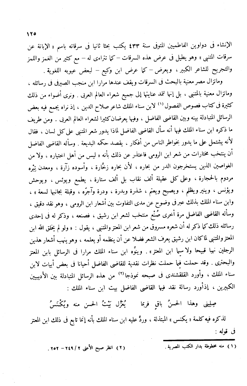 وتنتقل الخلافة فى العصر العباسى إلى بغداد، ويظل للشام نشاطها فى الشعر، وهو نشاط لا يقف عند مجرد نظمه على طريقة الإسلاميين والجاهليين، إذ نرى شعراءها يصدرون فى شعرهم عن النزعات التجديدية التى نظم الشعر العربى على أضوائها فى صدر الدولة العباسية. ومن كبار شعرائها الذين لمعت أسماؤهم فى القرن الثانى الهجرى عبد الملك بن عبد الرحيم الحارثى معاصر الرشيد، وكان من الفلجة «من أرض دمشق»، وترجم له ابن المعتز فى كتابه «طبقات الشعراء» وأشاد بشعره إشادة رائعة. وممن كان يعاصره من الشعراء الشاميين العتّابى وكان يحتذى-كما يقول الجاحظ-حذوبشار بن برد فى البديع وله ترجمة فى كتابنا العصر العباسى الأول. وعلى غراره تلميذه منصور النمرى الشامى، وله أيضا ترجمة فى كتابنا العصر العباسى الأول. وبالمثل فى هذا الكتاب ترجمة لشاعر شامى مهم عاش فى القرنين الثانى والثالث هو ديك الجن. فالشام لم تنشط فى الشعر طوال العصر العباسى الأول فحسب، بل قدمت إليه أعلام من الشعراء النابهين شاركوا فى نهضته وازدهاره بل أكثر من ذلك لقد تطورت بصور البديع الحسية التحديدية وأضافت إليها فى نهضته وازدهاره بل أكثر من ذلك لقد تطورت بصور البديع الحسية التحديدية وأضافت إليها صورا جديدة من بديع وزخرف معنويين رائعين، وبذلك استحدثت للشعر العربى مذهبا جديدا هو مذهب التصنيع أو التنميق الحسى والفكرى، على نحو ما هو معروف عن أبى تمام أستاذ هذا المذهب الذى أعطاه صيغته النهائية، وقد أوضحنا ذلك إيضاحا تاما فى كتابنا «الفن ومذاهبه فى الشعر العربى». وتلاه تلميذه البحترى، ولم يكن له ثقافته وتعمقه فى النفوذ إلى دقائق الأفكار، ومع ذلك تمسك بالمذهب وبخاصة جوانب البديع الحسى مع تمسك شديد بمقومات الشعر العربى وتقاليده فى الصياغة، وكان لا يبارى فى الضرب على قيثارة الشعر العربى واستخراج أروع النغم منها وأحلاه. وأكبّت الأجيال التالية فى العالم العربى على دراسته ودراسة أستاذه متخذة منه نموذجا للتمسك بعمود الشعر العربى وصياغته، كما اتخذت من أستاذه نموذجا للبديع الحسى والمعنوى الذى يرضى المتفلسفة والمتعمقين فى المعانى. وانقسم النقاد مع الشاعرين وفنهما إلى صفين متقابلين، وكل ذلك حاولنا تصويره فى كتابنا «الفن ومذاهبه فى الشعر العربى» ولأبى تمام ترجمة
