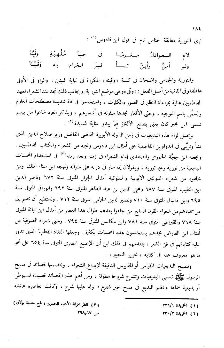ولم تعرف الشام التشيع المفرط الغالى إلا منذ القدّاح ودعوته الإسماعيلية التى اتخذ لها سلمية بالقرب من حمص وحماة مركزا، وأخذ القرامطة يشيعون هذه الدعوة بين بدو الشام، غير أن دمشق ظلت بعيدة عن التشيع على الأقل حتى أوائل القرن الرابع إذ نجد النسائى صاحب كتاب السنن يلم بها سنة 303 وكان يتشيع، فسألوه عن معاوية وما روى من فضائله فأبى أن يفضله، فما زالوا يدفعونه من المسجد، ويقال: داسوه بالأقدام. وخرج من دمشق خائفا يترقب إلى الرملة فمات بها. ويبدو أن الدعوة الشيعية-لقيت لها آذانا صاغية بحلب منذ مطالع القرن الرابع، ويلقانا هناك الصنوبرى المتوفى سنة 334 وكان يتشيع-فيما يبدو-تشيعا معتدلا. ونراه يذكر- ما يؤمن به الشيعة من وصية الرسول عليه السلام لعلى بالإمامة بعده، وله مراث فى الحسين تبكيه بكاء حارا من مثل قوله (¬5):