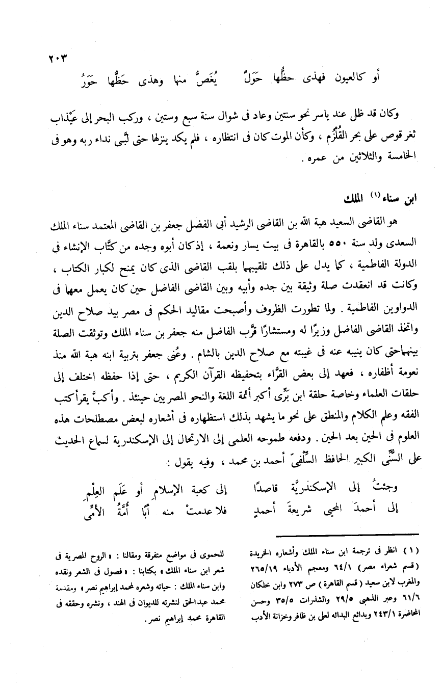 والصورة فى البيت الأخير رائعة فقد جعل كلفة البدر من أثر الترب العالق بجبهته لتوالى سجوده لصاحبته ولجمالها الساحر. ويقول إن زمانه تقضّى فى حرمان متلاحق من البعاد والهجرة المتصلة. ولحماد الخراط المتوفى سنة 565 قوله (¬1):