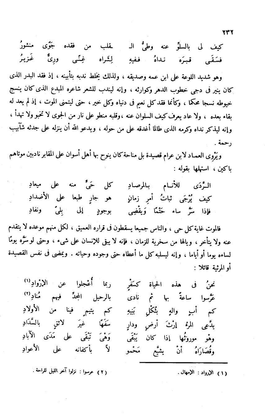 أن فيها الجوع والعطش فغير صحيح إذ فيها غنائم لا تحصى أخذت قهرا من حملة الصليب، وفيها غير بلد عربى ردّ منهم إلى أهله. وقد شارك هو نفسه نور الدين فى بعض انتصاراته عليهم، وحضر معه حصاره لحصن حارم سنة 559 للهجرة. وأدّته موجدته-فى رأينا-من نور الدين إلى أن يبرح دمشق إلى حصن كيفا بالموصل ويتخذها دار مقام له، وفيها يعكف على جمع ديوانه وتأليف كتبه، حتى إذا استولى صلاح الدين على دمشق سنة 570 استدعاه. ولبّاه مبتهجا، فأعطاه دارا بدمشق وإقطاعا لمعاشه وفسح له فى مجالسه، حتى إذا كانت سنة 584 للهجرة لبّى نداء ربه عن ستة وتسعين عاما.