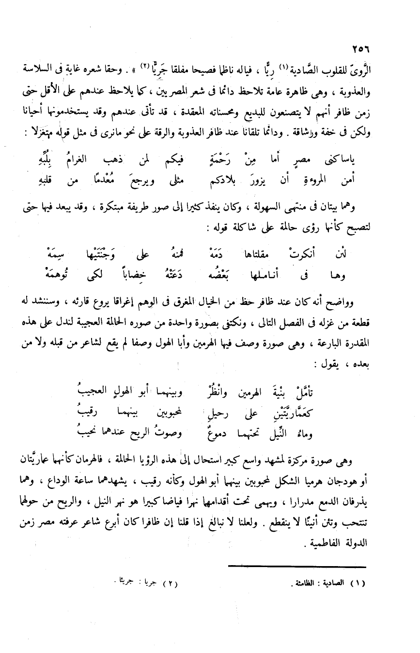 يقول إن ذنوب الدهر عنده كثيرة فلا يدرى لكثرتها، أى ذنب يعاتبها فيه هل يعاتبها فى فرقة الأحباب أو فيما ينزله به من خطوب يستعيذ الخوف من شرها وتفزع الأهوال. وتلك أمانيه ما تزال تجاذب الدهر ذيل الحظ تريد أن تجذبه إليها والدهر أشد جذبا، بل إنه جدال يصرع من ينازعه، وفى صدره همة تؤرق جفون الأمانى بما تعرضه عليها من وعود ما يزال الدهر لا يفى بها، وكأن وفاءه أمر محال. ويقول من قصيدة يشكو فيها من الزمان: