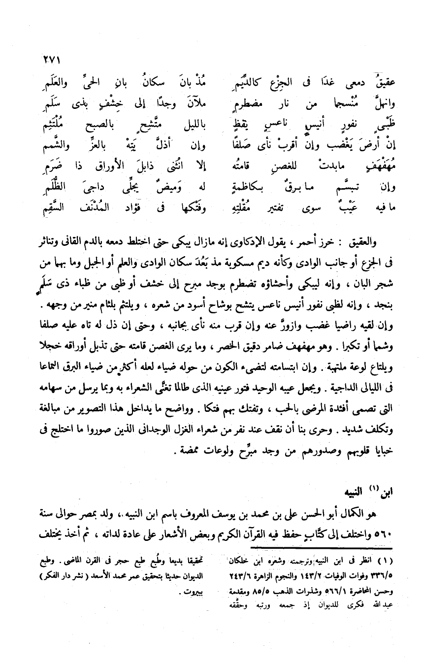 والصورة أيضا بديعة، فالبدر وهو يظهر ويغيب من خلال الأشجار كحسناء فى لجّة مرخية ذوائب شعرها وموج أضوائها من حولها يلعب فى فضاء الطبيعة الساحرة. وكان مغرى بوصف زهرة القرنفل، يصفها بيضاء وحمراء وبيضاء مشربة بحمرة كقوله: