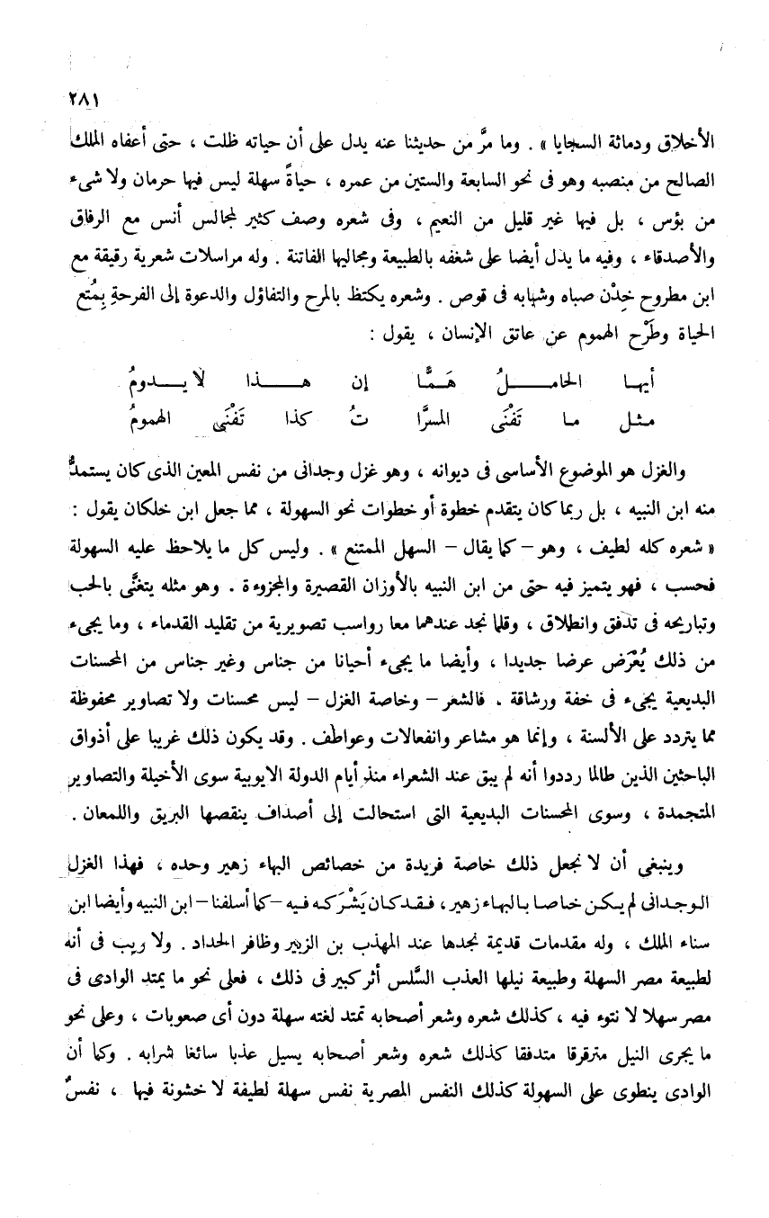 وهو يستغيث بالرسول الكريم صلّى الله عليه وسلم خاتم الرسل ومفرّج الكرب الذى ورد على جدثه الطاهر ومعينه العاطر الذى يشفى من كل داء عضال أن يكون شفيعا له يوم الحشر وأن يتيح له فيه-حين يشتد بالناس أوار العطش ولهيبه-كاسات من الرحيق الصافى. ويقول فى مدحة نبوية ثانية: