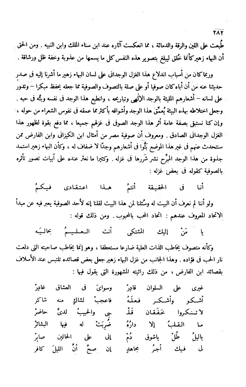 وموسيقى الأبيات بديعة. وقد تخلص تخلصا رائعا من الغزل إلى مديح المصطفى بذكر وشاح صاحبته الصائم كناية عن نحول خصرها مع لينه، فمن رآها-كما يقول-صلّى على الرسول إعجابا بها واستحسانا لها، ومضى يذكر مناجاة الرسول نهارا وتهجده ليلا وأن من يستجير به ينال كل مأمول ومطلب. وله مدحة عارض بها مدحة كعب بن زهير للرسول مقتبسا منها الشطور الثانية لقصيدته، فإن لم يقتبس شطرا اقتبس قافية.