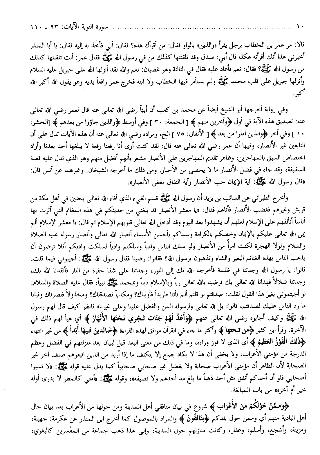 10] وفي آخر وَالَّذِينَ آمَنُوا مِنْ بَعْدُ [الأنفال: 75] إلخ، ومراده رضي الله تعالى عنه أن هذه الآيات تدل على أن التابعين غير الأنصار، وفيها أن عمر رضي الله تعالى عنه قال: لقد كنت أرى أنا رفعنا رفعة لا يبلغها أحد بعدنا وأراد اختصاص السبق بالمهاجرين، وظاهر تقديم المهاجرين على الأنصار مشعر بأنهم أفضل منهم وهو الذي تدل عليه قصة السقيفة، وقد جاء في فضل الأنصار ما لا يحصى من الأخبار. ومن ذلك ما
