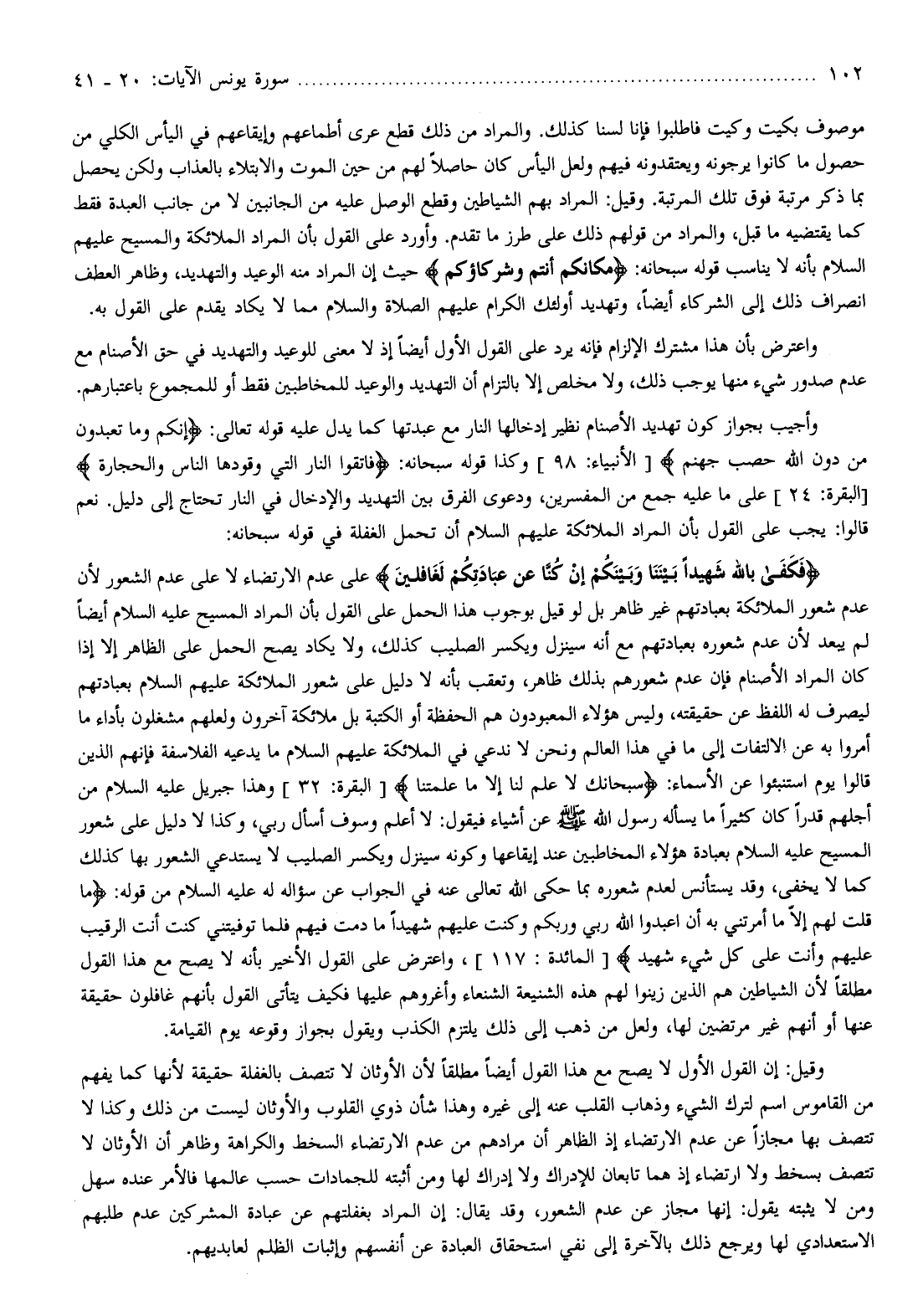 فَكَفى بِاللَّهِ شَهِيداً بَيْنَنا وَبَيْنَكُمْ إِنْ كُنَّا عَنْ عِبادَتِكُمْ لَغافِلِينَ على عدم الارتضاء لا على عدم الشعور لأن عدم شعور الملائكة بعبادتهم غير ظاهر بل لو قيل بوجوب هذا الحمل على القول بأن المراد المسيح عليه السلام أيضا لم يبعد لأن عدم شعوره بعبادتهم مع أنه سينزل ويكسر الصليب كذلك، ولا يكاد يصح الحمل على الظاهر إلا إذا كان المراد الأصنام فإن عدم شعورهم بذلك ظاهر، وتعقب بأنه لا دليل على شعور الملائكة عليهم السلام بعبادتهم ليصرف له اللفظ عن حقيقته، وليس هؤلاء المعبودون هم الحفظة أو الكتبة بل ملائكة آخرون ولعلهم مشغلون بأداء ما أمروا به عن الالتفات إلى ما في هذا العالم ونحن لا ندعي في الملائكة عليهم السلام ما يدعيه الفلاسفة فإنهم الذين قالوا يوم استنبئوا عن الأسماء: سُبْحانَكَ لا عِلْمَ لَنا إِلَّا ما عَلَّمْتَنا [البقرة: 32] وهذا جبريل عليه السلام من أجلهم قدرا كان كثيرا ما يسأله رسول الله صلّى الله عليه وسلم عن أشياء فيقول: لا أعلم وسوف أسأل ربي، وكذا لا دليل على شعور المسيح عليه السلام بعبادة هؤلاء المخاطبين عند إيقاعها وكونه سينزل ويكسر الصليب لا يستدعي الشعور بها كذلك كما لا يخفى، وقد يستأنس لعدم شعوره بما حكى الله تعالى عنه في الجواب عن سؤاله له عليه السلام من قوله: ما قُلْتُ لَهُمْ إِلَّا ما أَمَرْتَنِي بِهِ أَنِ اعْبُدُوا اللَّهَ رَبِّي وَرَبَّكُمْ وَكُنْتُ عَلَيْهِمْ شَهِيداً ما دُمْتُ فِيهِمْ فَلَمَّا تَوَفَّيْتَنِي كُنْتَ أَنْتَ الرَّقِيبَ عَلَيْهِمْ وَأَنْتَ عَلى كُلِّ شَيْءٍ شَهِيدٌ [المائدة: 117] ، واعترض على القول الأخير بأنه لا يصح مع هذا القول مطلقا لأن الشياطين هم الذين زينوا لهم هذه الشنيعة الشنعاء وأغروهم عليها فكيف يتأتى القول بأنهم غافلون حقيقة عنها أو أنهم غير مرتضين لها، ولعل من ذهب إلى ذلك يلتزم الكذب ويقول بجواز وقوعه يوم القيامة.
