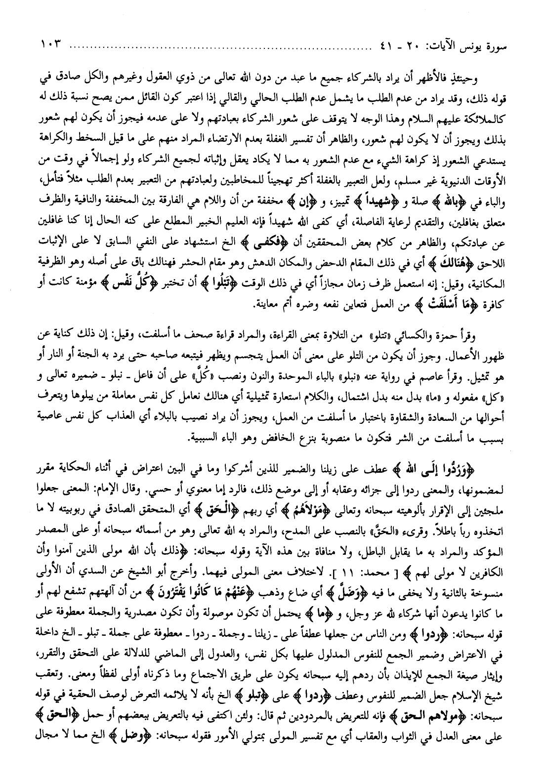 وَرُدُّوا إِلَى اللَّهِ عطف على زيلنا والضمير للذين أشركوا وما في البين اعتراض في أثناء الحكاية مقرر لمضمونها، والمعنى ردوا إلى جزائه وعقابه أو إلى موضع ذلك، فالرد إما معنوي أو حسي. وقال الإمام: المعنى جعلوا ملجئين إلى الإقرار بألوهيته سبحانه وتعالى مَوْلاهُمُ أي ربهم الْحَقِّ أي المتحقق الصادق في ربوبيته لا ما اتخذوه ربا باطلا. وقرئ «الحقّ» بالنصب على المدح، والمراد به الله تعالى وهو من أسمائه سبحانه أو على المصدر المؤكد والمراد به ما يقابل الباطل، ولا منافاة بين هذه الآية وقوله سبحانه: ذلِكَ بِأَنَّ اللَّهَ مَوْلَى الَّذِينَ آمَنُوا وَأَنَّ الْكافِرِينَ لا مَوْلى لَهُمْ [محمد: 11] . لاختلاف معنى المولى فيهما. وأخرج أبو الشيخ عن السدي أن الأولى منسوخة بالثانية ولا يخفى ما فيه وَضَلَّ أي ضاع وذهب عَنْهُمْ ما كانُوا يَفْتَرُونَ من أن آلهتهم تشفع لهم أو ما كانوا يدعون أنها شركاء لله عز وجل، وما يحتمل أن تكون موصولة وأن تكون مصدرية والجملة معطوفة على قوله سبحانه: رُدُّوا ومن الناس من جعلها عطفا على- زيلنا- وجملة- ردوا- معطوفة على جملة- تبلو- إلخ داخلة في الاعتراض وضمير الجمع للنفوس المدلول عليها بكل نفس، والعدول إلى الماضي للدلالة على التحقق والتقرر، وإيثار صيغة الجمع للإيذان بأن ردهم إليه سبحانه يكون على طريق الاجتماع وما ذكرناه أولى لفظا ومعنى. وتعقب شيخ الإسلام جعل الضمير للنفوس وعطف رُدُّوا على تَبْلُوا إلخ بأنه لا يلائمه التعرض لوصف الحقية في قوله سبحانه: مَوْلاهُمُ الْحَقِّ فإنه للتعريض بالمردودين ثم قال: ولئن اكتفى فيه بالتعريض ببعضهم أو حمل الْحَقِّ على معنى العدل في الثواب والعقاب أي مع تفسير المولى بمتولي الأمور فقوله سبحانه: وَضَلَّ إلخ مما لا مجال