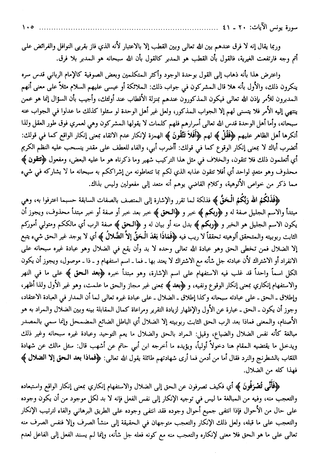 وربما يقال إنه لا فرق عندهم بين الله تعالى وبين القطب إلا بالاعتبار لأنه الذي فاز بقربى النوافل والفرائض على أتم وجه فارتفعت الغيرية، فالقول بأن القطب هو المدبر كالقول بأنّ الله سبحانه هو المدبر بلا فرق.