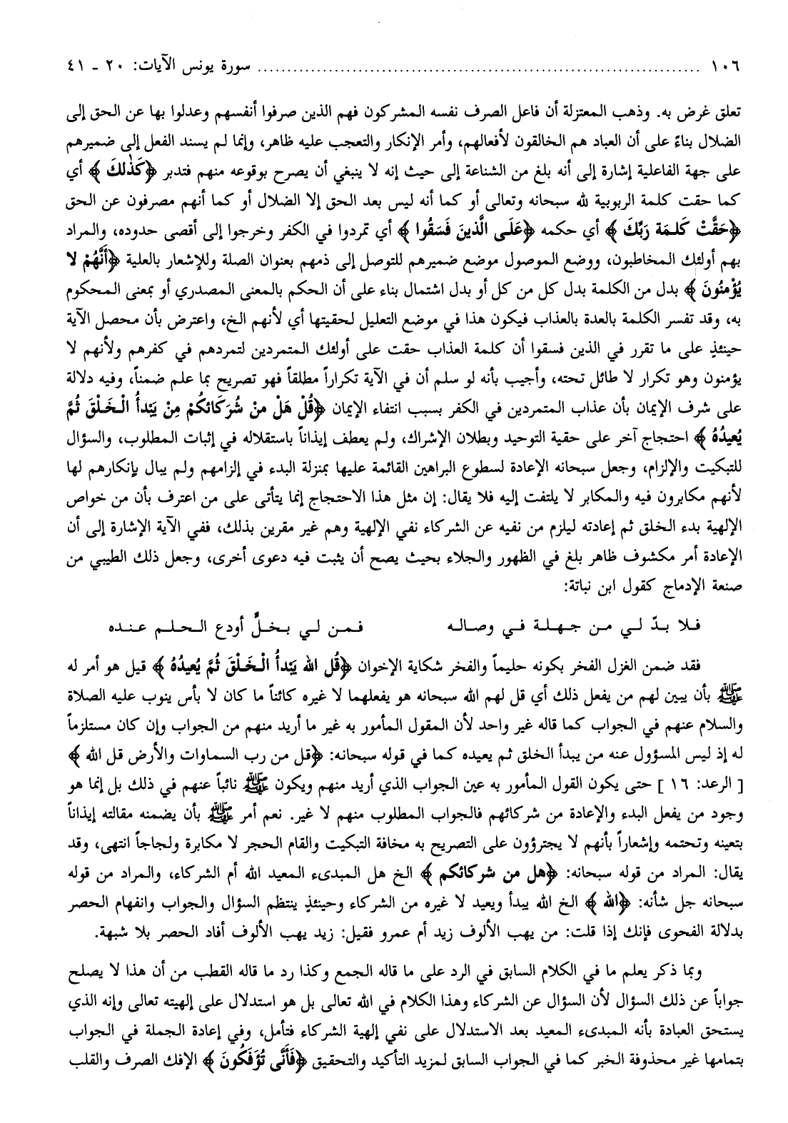تعلق غرض به. وذهب المعتزلة أن فاعل الصرف نفسه المشركون فهم الذين صرفوا أنفسهم وعدلوا بها عن الحق إلى الضلال بناء على أن العباد هم الخالقون لأفعالهم، وأمر الإنكار والتعجب عليه ظاهر، وإنما لم يسند الفعل إلى ضميرهم على جهة الفاعلية إشارة إلى أنه بلغ من الشناعة إلى حيث إنه لا ينبغي أن يصرح بوقوعه منهم فتدبر كَذلِكَ أي كما حقت كلمة الربوبية لله سبحانه وتعالى أو كما أنه ليس بعد الحق إلا الضلال أو كما أنهم مصرفون عن الحق حَقَّتْ كَلِمَةُ رَبِّكَ أي حكمه عَلَى الَّذِينَ فَسَقُوا أي تمردوا في الكفر وخرجوا إلى أقصى حدوده، والمراد بهم أولئك المخاطبون، ووضع الموصول موضع ضميرهم للتوصل إلى ذمهم بعنوان الصلة وللإشعار بالعلية أَنَّهُمْ لا يُؤْمِنُونَ بدل من الكلمة بدل كل من كل أو بدل اشتمال بناء على أن الحكم بالمعنى المصدري أو بمعنى المحكوم به، وقد تفسر الكلمة بالعدة بالعذاب فيكون هذا في موضع التعليل لحقيتها أي لأنهم إلخ، واعترض بأن محصل الآية حينئذ على ما تقرر في الذين فسقوا أن كلمة العذاب حقت على أولئك المتمردين لتمردهم في كفرهم ولأنهم لا يؤمنون وهو تكرار لا طائل تحته، وأجيب بأنه لو سلم أن في الآية تكرارا مطلقا فهو تصريح بما علم ضمنا، وفيه دلالة على شرف الإيمان بأن عذاب المتمردين في الكفر بسبب انتفاء الإيمان قُلْ هَلْ مِنْ شُرَكائِكُمْ مَنْ يَبْدَؤُا الْخَلْقَ ثُمَّ يُعِيدُهُ احتجاج آخر على حقية التوحيد وبطلان الإشراك، ولم يعطف إيذانا باستقلاله في إثبات المطلوب، والسؤال للتبكيت والإلزام، وجعل سبحانه الإعادة لسطوع البراهين القائمة عليها بمنزلة البدء في إلزامهم ولم يبال بإنكارهم لها لأنهم مكابرون فيه والمكابر لا يلتفت إليه فلا يقال: إن مثل هذا الاحتجاج إنما يتأتى على من اعترف بأن من خواص الإلهية بدء الخلق ثم إعادته ليلزم من نفيه عن الشركاء نفي الإلهية وهم غير مقرين بذلك، ففي الآية الإشارة إلى أن الإعادة أمر مكشوف ظاهر بلغ في الظهور والجلاء بحيث يصح أن يثبت فيه دعوى أخرى، وجعل ذلك الطيبي من صنعة الإدماج كقول ابن نباتة: