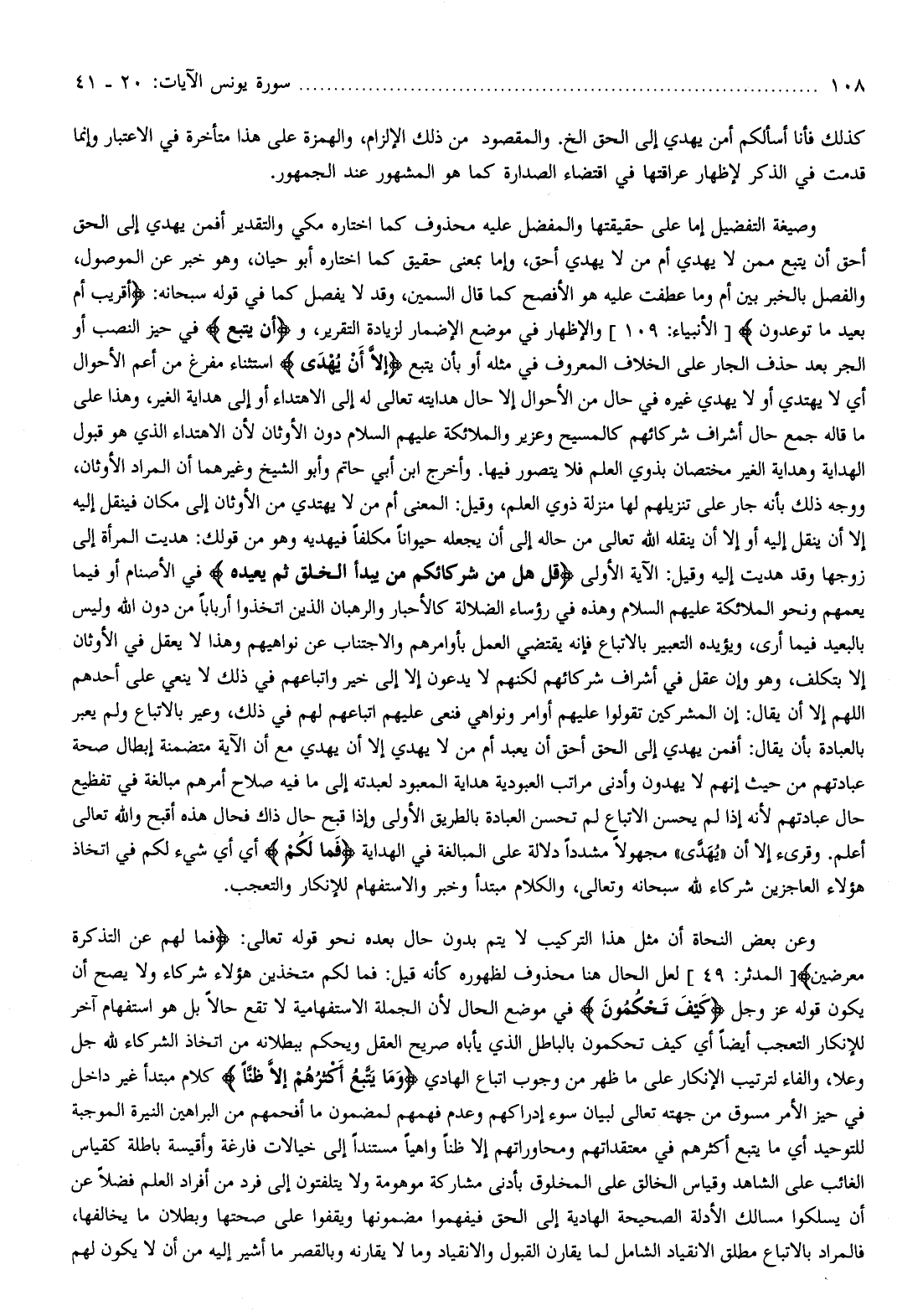 وصيغة التفضيل إما على حقيقتها والمفضل عليه محذوف كما اختاره مكي والتقدير أفمن يهدي إلى الحق أحق أن يتبع ممن لا يهدي أم من لا يهدي أحق، وإما بمعنى حقيق كما اختاره أبو حيان، وهو خبر عن الموصول، والفصل بالخبر بين أم وما عطفت عليه هو الأفصح كما قال السمين، وقد لا يفصل كما في قوله سبحانه: أَقَرِيبٌ أَمْ بَعِيدٌ ما تُوعَدُونَ [الأنبياء: 109] والإظهار في موضع الإضمار لزيادة التقرير، وأَنْ يُتَّبَعَ في حيز النصب أو الجر بعد حذف الجار على الخلاف المعروف في مثله أو بأن يتبع إِلَّا أَنْ يُهْدى استثناء مفرغ من أعم الأحوال أي لا يهتدي أو لا يهدي غيره في حال من الأحوال إلا حال هدايته تعالى له إلى الاهتداء أو إلى هداية الغير، وهذا على ما قاله جمع حال أشراف شركائهم كالمسيح وعزير والملائكة عليهم السلام دون الأوثان لأن الاهتداء الذي هو قبول الهداية وهداية الغير مختصان بذوي العلم فلا يتصور فيها. وأخرج ابن أبي حاتم وأبو الشيخ وغيرهما أن المراد الأوثان، ووجه ذلك بأنه جار على تنزيلهم لها منزلة ذوي العلم، وقيل: المعنى أم من لا يهتدي من الأوثان إلى مكان فينقل إليه إلا أن ينقل إليه أو إلا أن ينقله الله تعالى من حاله إلى أن يجعله حيوانا مكلفا فيهديه وهو من قولك: هديت المرأة إلى زوجها وقد هديت إليه وقيل: الآية الأولى قُلْ هَلْ مِنْ شُرَكائِكُمْ مَنْ يَبْدَؤُا الْخَلْقَ ثُمَّ يُعِيدُهُ في الأصنام أو فيما يعمهم ونحو الملائكة عليهم السلام وهذه في رؤساء الضلالة كالأحبار والرهبان الذين اتخذوا أربابا من دون الله وليس بالبعيد فيما أرى، ويؤيده التعبير بالاتباع فإنه يقتضي العمل بأوامرهم والاجتناب عن نواهيهم وهذا لا يعقل في الأوثان إلا بتكلف، وهو وإن عقل في أشراف شركائهم لكنهم لا يدعون إلا إلى خير واتباعهم في ذلك لا ينعي على أحدهم اللهم إلا أن يقال: إن المشركين تقولوا عليهم أوامر ونواهي فنعى عليهم اتباعهم لهم في ذلك، وعير بالاتباع ولم يعبر بالعبادة بأن يقال: أفمن يهدي إلى الحق أحق أن يعبد أم من لا يهدي إلا أن يهدي مع أن الآية متضمنة إبطال صحة عبادتهم من حيث إنهم لا يهدون وأدنى مراتب العبودية هداية المعبود لعبدته إلى ما فيه صلاح أمرهم مبالغة في تفظيع حال عبادتهم لأنه إذا لم يحسن الاتباع لم تحسن العبادة بالطريق الأولى وإذا قبح حال ذاك فحال هذه أقبح والله تعالى أعلم. وقرىء إلا أن «يهدّى» مجهولا مشددا دلالة على المبالغة في الهداية فَما لَكُمْ أي أي شيء لكم في اتخاذ هؤلاء العاجزين شركاء لله سبحانه وتعالى، والكلام مبتدأ وخبر والاستفهام للإنكار والتعجب.