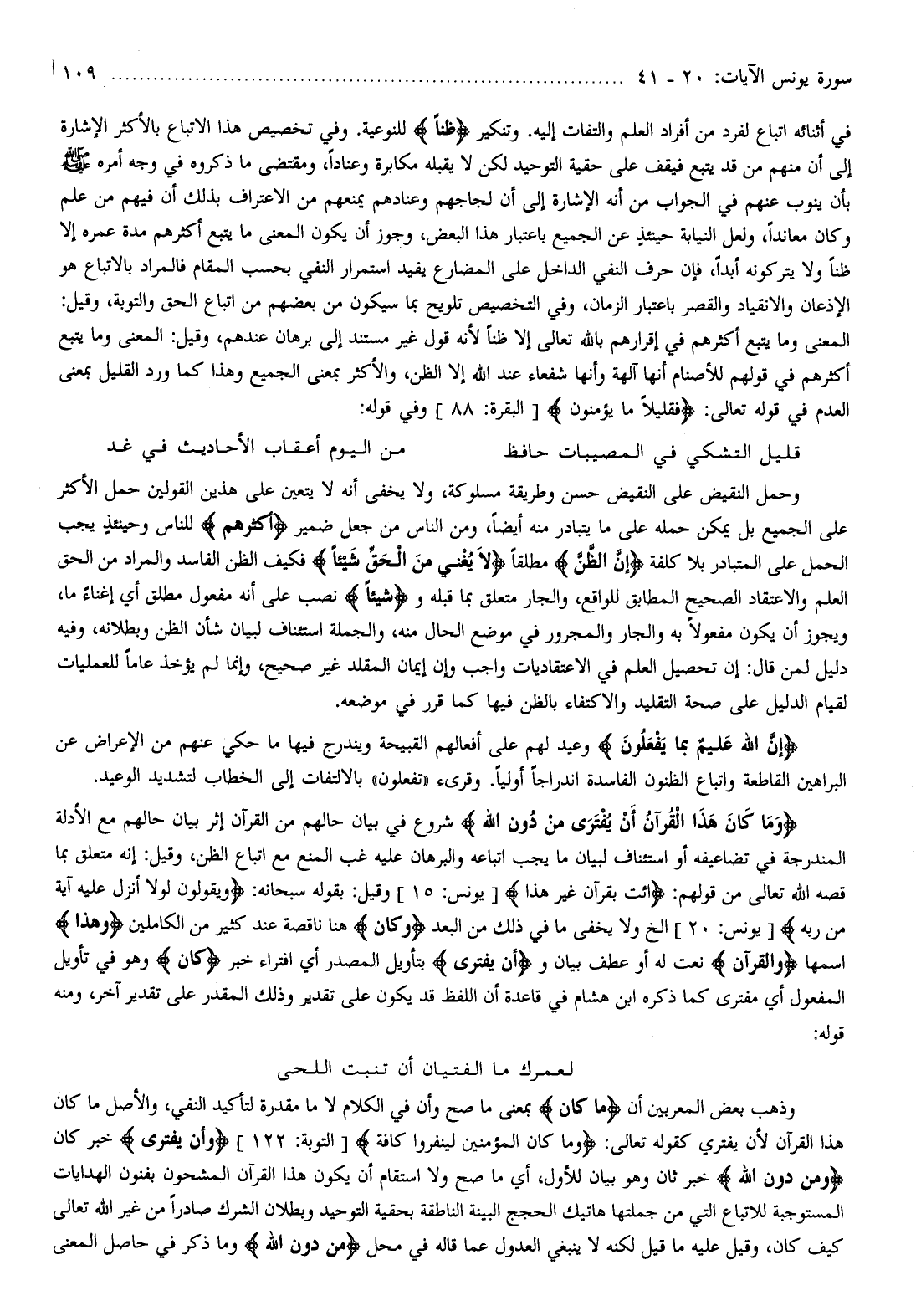 المعنى وما يتبع أكثرهم في إقرارهم بالله تعالى إلا ظنا لأنه قول غير مستند إلى برهان عندهم، وقيل: المعنى وما يتبع أكثرهم في قولهم للأصنام أنها آلهة وأنها شفعاء عند الله إلا الظن، والأكثر بمعنى الجميع وهذا كما ورد القليل بمعنى العدم في قوله تعالى: فَقَلِيلًا ما يُؤْمِنُونَ [البقرة: 88] وفي قوله: