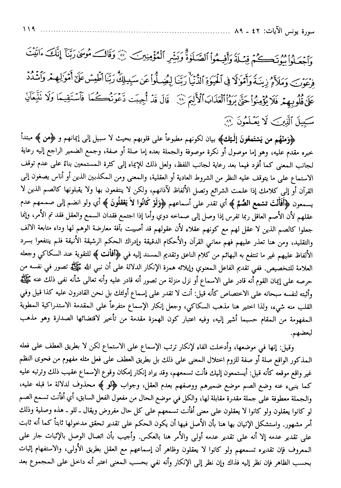 وَمِنْهُمْ مَنْ يَسْتَمِعُونَ إِلَيْكَ بيان لكونهم مطبوعا على قلوبهم بحيث لا سبيل إلى إيمانهم ومَنْ مبتدأ خبره مقدم عليه، وهو إما موصول أو نكرة موصوفة والجملة بعده إما صلة أو صفة، وجمع الضمير الراجع إليه رعاية لجانب المعنى كما أفرد فيما بعد رعاية لجانب اللفظ، ولعل ذلك للإيماء إلى كثرة المستمعين بناء على عدم توقف الاستماع على ما يتوقف عليه النظر من الشروط العادية أو العقلية، والمعنى ومن المكذبين الذين أو أناس يصغون إلى القرآن أو إلى كلامك إذا علمت الشرائع وتصل الألفاظ لآذانهم، ولكن لا ينتفعون بها ولا يقبلونها كالصم الذين لا يسمعون أَفَأَنْتَ تُسْمِعُ الصُّمَّ أي تقدر على أسماعهم وَلَوْ كانُوا لا يَعْقِلُونَ أي ولو انضم إلى صممهم عدم عقلهم لأن الأصم العاقل ربما تفرس إذا وصل إلى صماخه دوي وأما إذا اجتمع فقدان السمع والعقل فقد تم الأمر، وإنما جعلوا كالصم الذين لا عقل لهم مع كونهم عقلاء لأن عقولهم قد أصيبت بآفة معارضة الوهم لها وداء متابعة الالف والتقليد، ومن هنا تعذر عليهم فهم معاني القرآن والأحكام الدقيقة وإدراك الحكم الرشيقة الأنيقة فلم ينتفعوا بسرد الألفاظ عليهم غير ما تنتفع به البهائم من كلام الناعق وتقديم المسند إليه في أَفَأَنْتَ للتقوية عند السكاكي وجعله العلامة للتخصيص. ففي تقديم الفاعل المعنوي وإيلائه همزة الإنكار الدلالة على أن نبي الله صلّى الله عليه وسلم تصور في نفسه من حرصه على إيمان القوم أنه قادر على الاسماع أو نزل منزلة من تصور أنه قادر عليه وأنه تعالى شأنه نفى ذلك عنه صلّى الله عليه وسلم وأثبته لنفسه سبحانه على الاختصاص كأنه قيل: أنت لا تقدر على إسماع أولئك بل نحن القادرون عليه كذا قيل وفي القلب منه شيء، ولذا اختير هنا مذهب السكاكي، وجعل إنكار الإسماع متفرعا على المقدمة الاستدراكية المطوية المفهومة من المقام حسبما أشير إليه، وفيه اعتبار كون الهمزة مقدمة من تأخير لاقتضائها الصدارة وهو مذهب لبعضهم.