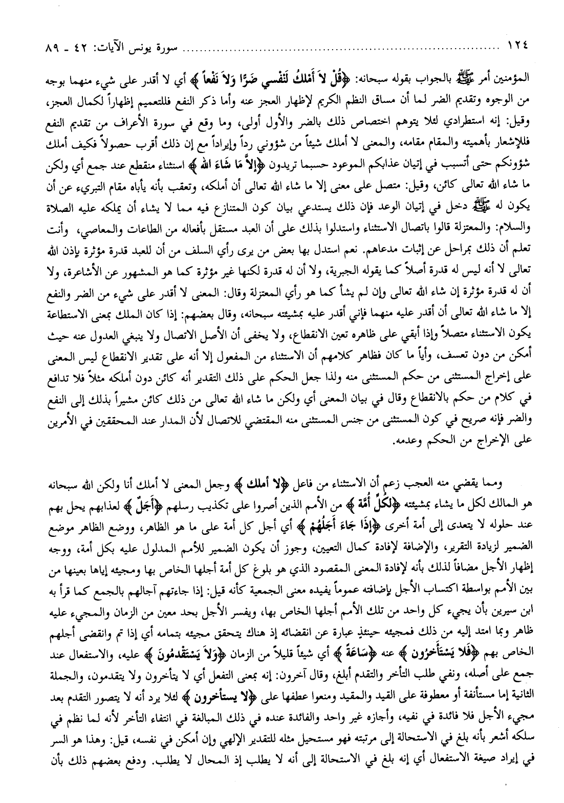 المؤمنين أمر صلّى الله عليه وسلم بالجواب بقوله سبحانه: قُلْ لا أَمْلِكُ لِنَفْسِي ضَرًّا وَلا نَفْعاً أي لا أقدر على شيء منهما بوجه من الوجوه وتقديم الضر لما أن مساق النظم الكريم لإظهار العجز عنه وأما ذكر النفع فللتعميم إظهارا لكمال العجز، وقيل: إنه استطرادي لئلا يتوهم اختصاص ذلك بالضر والأول أولى، وما وقع في سورة الأعراف من تقديم النفع فللإشعار بأهميته والمقام مقامه، والمعنى لا أملك شيئا من شؤوني ردا وإيرادا مع إن ذلك أقرب حصولا فكيف أملك شؤونكم حتى أتسبب في إتيان عذابكم الموعود حسبما تريدون إِلَّا ما شاءَ اللَّهُ استثناء منقطع عند جمع أي ولكن ما شاء الله تعالى كائن، وقيل: متصل على معنى إلا ما شاء الله تعالى أن أملكه، وتعقب بأنه يأباه مقام التبري عن أن يكون له صلّى الله عليه وسلم دخل في إتيان الوعد فإن ذلك يستدعي بيان كون المتنازع فيه مما لا يشاء أن يملكه عليه الصلاة والسلام: والمعتزلة قالوا باتصال الاستثناء واستدلوا بذلك على أن العبد مستقل بأفعاله من الطاعات والمعاصي، وأنت تعلم أن ذلك بمراحل عن إثبات مدعاهم. نعم استدل بها بعض من يرى رأي السلف من أن للعبد قدرة مؤثرة بإذن الله تعالى لا أنه ليس له قدرة أصلا كما يقوله الجبرية، ولا أن له قدرة لكنها غير مؤثرة كما هو المشهور عن الأشاعرة، ولا أن له قدرة مؤثرة إن شاء الله تعالى وإن لم يشأ كما هو رأي المعتزلة وقال: المعنى لا أقدر على شيء من الضر والنفع إلا ما شاء الله تعالى أن أقدر عليه منهما فإني أقدر عليه بمشيئته سبحانه، وقال بعضهم: إذا كان الملك بمعنى الاستطاعة يكون الاستثناء متصلا وإذا أبقي على ظاهره تعين الانقطاع، ولا يخفى أن الأصل الاتصال ولا ينبغي العدول عنه حيث أمكن من دون تعسف، وأيا ما كان فظاهر كلامهم أن الاستثناء من المفعول إلا أنه على تقدير الانقطاع ليس المعنى على إخراج المستثنى من حكم المستثنى منه ولذا جعل الحكم على ذلك التقدير أنه كائن دون أملكه مثلا فلا تدافع في كلام من حكم بالانقطاع وقال في بيان المعنى أي ولكن ما شاء الله تعالى من ذلك كائن مشيرا بذلك إلى النفع والضر فإنه صريح في كون المستثنى من جنس المستثنى منه المقتضي للاتصال لأن المدار عند المحققين في الأمرين على الإخراج من الحكم وعدمه.