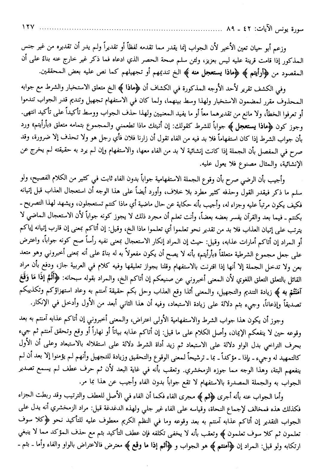 وأما الجواب عنه بأنه أجرى ثُمَّ مجرى الفاء فكما أن الفاء في الأصل للعطف والترتيب وقد ربطت الجزاء فكذلك هذه فمخالف لإجماع النحاة، وقياسه على الفاء غير جلي ولهذه الدغدغة قيل: مراد الزمخشري أنه يدل على الجواب التقدير إن أتاكم عذابه آمنتم به بعد وقوعه وما في النظم الكريم معطوف عليه للتأكيد نحو كَلَّا سَوْفَ تَعْلَمُونَ ثُمَّ كَلَّا سَوْفَ تَعْلَمُونَ وتعقب بأنه لا يخفى تكلفه فإن عطف التأكيد بثم مع حذف المؤكد مما لا ينبغي ارتكابه ولو قيل: المراد إن آمَنْتُمْ هو الجواب وأَ ثُمَّ إِذا ما وَقَعَ معترض فالاعتراض بالواو والفاء وأما- بثم-