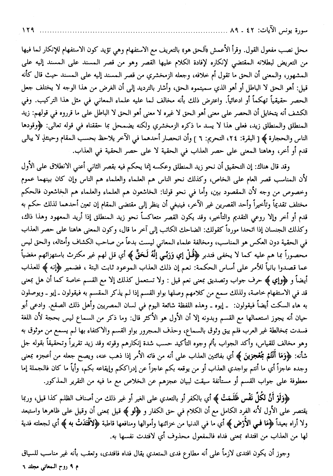 وقد قال هناك: إن التحقيق أن نحو زيد المنطلق وعكسه إنما يحكم فيه بقصر الثاني أعني الانطلاق على الأول لأن المناسب قصر العام على الخاص، وكذلك نحو الناس هم العلماء والعلماء هم الناس وإن كان بينهما عموم وخصوص من وجه لأن المقصود بين، وأما في نحو قولنا: الخاشعون هم العلماء والعلماء هم الخاشعون فالحكم مختلف تقديما وتأخيرا وأحد القصرين غير الآخر، فينبغي أن ينظر إلى مقتضى المقام إن تعين أحدهما لذلك حكم به قدم أو أخر وإلا روعي التقديم والتأخير، وقد يكون القصر متعاكسا نحو زيد المنطلق إذا أريد المعهود وهذا ذاك، وكذلك الجنسان إذا اتحدا موردا كقولك: الضاحك الكاتب إلى آخر ما قال، وكون المعنى هاهنا على حصر العذاب في الحقية دون العكس هو المناسب، ومخالفة علماء المعاني ليست بدعا من صاحب الكشاف وأمثاله، والحق ليس محصورا بما هم عليه كما لا يخفى فتدبر قُلْ إِي وَرَبِّي إِنَّهُ لَحَقٌّ أي قل لهم غير مكترث باستهزائهم مغضيا عما قصدوا بانيا للأمر على أساس الحكمة: نعم إن ذلك العذاب الموعود ثابت البتة، فضمير إِنَّهُ للعذاب أيضا وإِي حرف جواب وتصديق بمعنى نعم قيل: ولا تستعمل كذلك إلا مع القسم خاصة كما أن هل بمعنى قد في الاستفهام خاصة، ولذلك سمع من كلامهم وصلها بواو القسم إذا لم يذكر المقسم به فيقولون- إيو- ويوصلون به هاء السكت أيضا فيقولون:- إيوه- وهذه اللفظة شائعة اليوم في لسان المصريين وأهل ذلك الصقع. وادعى أبو حيان أنه يجوز استعمالها مع القسم وبدونه إلا أن الأول هو الأكثر قال: وما ذكر من السماع ليس بحجة لأن اللغة فسدت بمخالطة غير العرب فلم يبق وثوق بالسماع، وحذف المجرور بواو القسم والاكتفاء بها لم يسمع من موثوق به وهو مخالف للقياس، وأكد الجواب بأتم وجوه التأكيد حسب شدة إنكارهم وقوته وقد زيد تقريرا وتحقيقا بقوله جل شأنه: وَما أَنْتُمْ بِمُعْجِزِينَ أي بفائتين العذاب على أنه من فاته الأمر إذا ذهب عنه، ويصح جعله من أعجزه بمعنى وجده عاجزا أي ما أنتم بواجدي العذاب أو من يوقعه بكم عاجزا عن إدراككم وإيقاعه بكم، وأيا ما كان فالجملة إما معطوفة على جواب القسم أو مستأنفة سيقت لبيان عجزهم عن الخلاص مع ما فيه من التقرير المذكور.