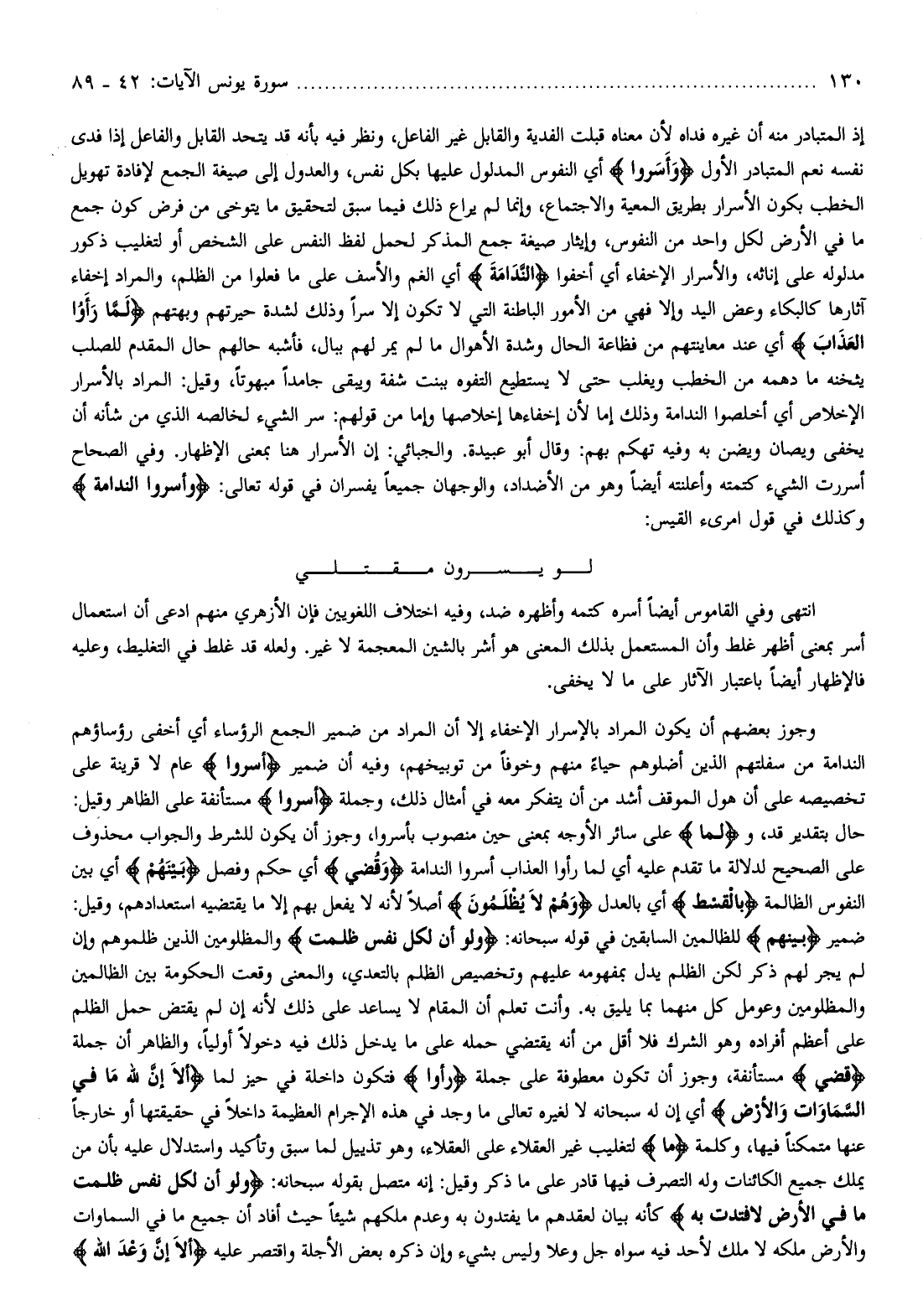 إذ المتبادر منه أن غيره فداه لأن معناه قبلت الفدية والقابل غير الفاعل، ونظر فيه بأنه قد يتحد القابل والفاعل إذا فدى نفسه نعم المتبادر الأول وَأَسَرُّوا أي النفوس المدلول عليها بكل نفس، والعدول إلى صيغة الجمع لإفادة تهويل الخطب بكون الأسرار بطريق المعية والاجتماع، وإنما لم يراع ذلك فيما سبق لتحقيق ما يتوخى من فرض كون جمع ما في الأرض لكل واحد من النفوس، وإيثار صيغة جمع المذكر لحمل لفظ النفس على الشخص أو لتغليب ذكور مدلوله على إنائه، والأسرار الإخفاء أي أخفوا النَّدامَةَ أي الغم والأسف على ما فعلوا من الظلم، والمراد إخفاء آثارها كالبكاء وعض اليد وإلا فهي من الأمور الباطنة التي لا تكون إلا سرا وذلك لشدة حيرتهم وبهتهم لَمَّا رَأَوُا الْعَذابَ أي عند معاينتهم من فظاعة الحال وشدة الأهوال ما لم يمر لهم ببال، فأشبه حالهم حال المقدم للصلب يثخنه ما دهمه من الخطب ويغلب حتى لا يستطيع التفوه ببنت شفة ويبقى جامدا مبهوتا، وقيل: المراد بالأسرار الإخلاص أي أخلصوا الندامة وذلك إما لأن إخفاءها إخلاصها وإما من قولهم: سر الشيء لخالصه الذي من شأنه أن يخفى ويصان ويضن به وفيه تهكم بهم: وقال أبو عبيدة. والجبائي: إن الأسرار هنا بمعنى الإظهار. وفي الصحاح أسررت الشيء كتمته وأعلنته أيضا وهو من الأضداد، والوجهان جميعا يفسران في قوله تعالى: وَأَسَرُّوا النَّدامَةَ وكذلك في قول امرئ القيس: