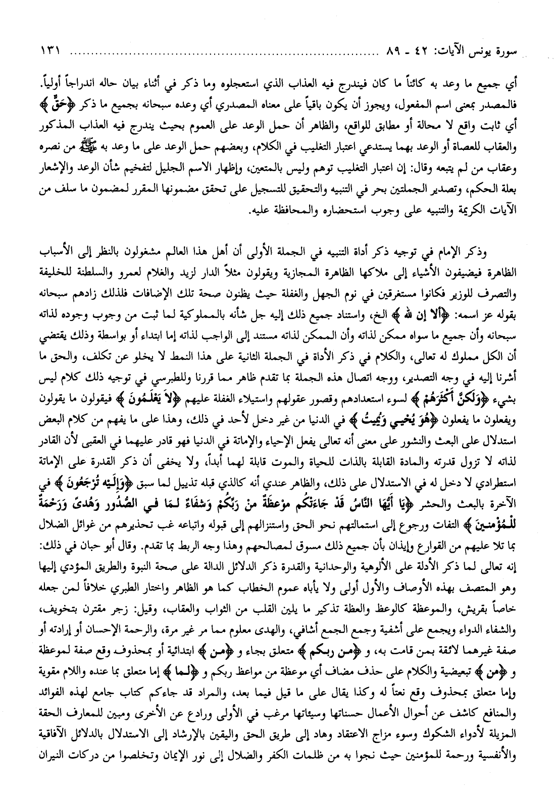وذكر الإمام في توجيه ذكر أداة التنبيه في الجملة الأولى أن أهل هذا العالم مشغولون بالنظر إلى الأسباب الظاهرة فيضيفون الأشياء إلى ملاكها الظاهرة المجازية ويقولون مثلا الدار لزيد والغلام لعمرو والسلطنة للخليفة والتصرف للوزير فكانوا مستغرقين في نوم الجهل والغفلة حيث يظنون صحة تلك الإضافات فلذلك زادهم سبحانه بقوله عز اسمه: أَلا إِنَّ لِلَّهِ إلخ، واستناد جميع ذلك إليه جل شأنه بالمملوكية لما ثبت من وجوب وجوده لذاته سبحانه وأن جميع ما سواه ممكن لذاته وأن الممكن لذاته مستند إلى الواجب لذاته إما ابتداء أو بواسطة وذلك يقتضي أن الكل مملوك له تعالى، والكلام في ذكر الأداة في الجملة الثانية على هذا النمط لا يخلو عن تكلف، والحق ما أشرنا إليه في وجه التصدير، ووجه اتصال هذه الجملة بما تقدم ظاهر مما قررنا وللطبرسي في توجيه ذلك كلام ليس بشيء وَلكِنَّ أَكْثَرَهُمْ لسوء استعدادهم وقصور عقولهم واستيلاء الغفلة عليهم لا يَعْلَمُونَ فيقولون ما يقولون ويفعلون ما يفعلون هُوَ يُحيِي وَيُمِيتُ في الدنيا من غير دخل لأحد في ذلك، وهذا على ما يفهم من كلام البعض استدلال على البعث والنشور على معنى أنه تعالى يفعل الإحياء والإماتة في الدنيا فهو قادر عليهما في العقبى لأن القادر لذاته لا تزول قدرته والمادة القابلة بالذات للحياة والموت قابلة لهما أبدا، ولا يخفى أن ذكر القدرة على الإماتة استطرادي لا دخل له في الاستدلال على ذلك، والظاهر عندي أنه كالذي قبله تذييل لما سبق وَإِلَيْهِ تُرْجَعُونَ في الآخرة بالبعث والحشر يا أَيُّهَا النَّاسُ قَدْ جاءَتْكُمْ مَوْعِظَةٌ مِنْ رَبِّكُمْ وَشِفاءٌ لِما فِي الصُّدُورِ وَهُدىً وَرَحْمَةٌ لِلْمُؤْمِنِينَ التفات ورجوع إلى استمالتهم نحو الحق واستنزالهم إلى قبوله واتباعه غب تحذيرهم من غوائل الضلال بما تلا عليهم من القوارع وإيذان بأن جميع ذلك مسوق لمصالحهم وهذا وجه الربط بما تقدم. وقال أبو حبان في ذلك: