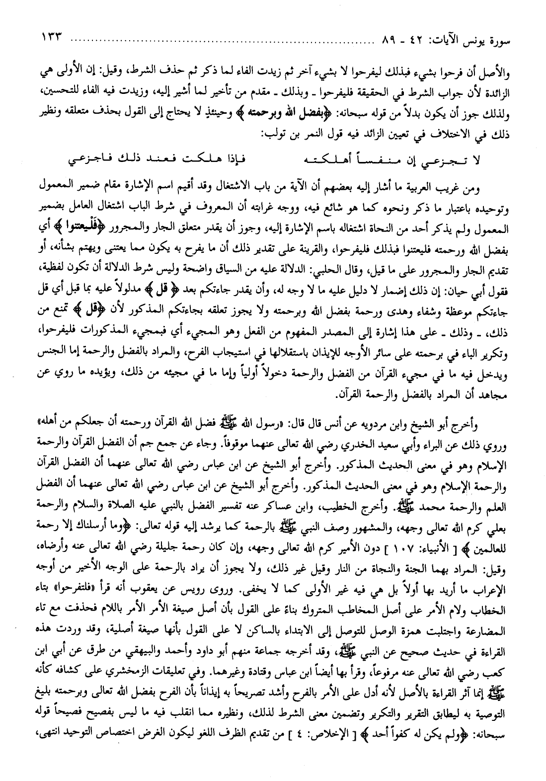 وجاء عن جمع جم أن الفضل القرآن والرحمة الإسلام وهو في معنى الحديث المذكور. وأخرج أبو الشيخ عن ابن عباس رضي الله تعالى عنهما أن الفضل القرآن والرحمة الإسلام وهو في معنى الحديث المذكور. وأخرج أبو الشيخ عن ابن عباس رضي الله تعالى عنهما أن الفضل العلم والرحمة محمد صلّى الله عليه وسلم. وأخرج الخطيب، وابن عساكر عنه تفسير الفضل بالنبي عليه الصلاة والسلام والرحمة بعلي كرم الله تعالى وجهه، والمشهور وصف النبي صلّى الله عليه وسلم بالرحمة كما يرشد إليه قوله تعالى: وَما أَرْسَلْناكَ إِلَّا رَحْمَةً لِلْعالَمِينَ [الأنبياء: 107] دون الأمير كرم الله تعالى وجهه، وإن كان رحمة جليلة رضي الله تعالى عنه وأرضاه، وقيل: المراد بهما الجنة والنجاة من النار وقيل غير ذلك، ولا يجوز أن يراد بالرحمة على الوجه الأخير من أوجه الإعراب ما أريد بها أولا بل هي فيه غير الأولى كما لا يخفى. وروى رويس عن يعقوب أنه قرأ «فلتفرحوا» بتاء الخطاب ولام الأمر على أصل المخاطب المتروك بناء على القول بأن أصل صيغة الأمر الأمر باللام فحذفت مع تاء المضارعة واجتلبت همزة الوصل للتوصل إلى الابتداء بالساكن لا على القول بأنها صيغة أصلية، وقد وردت هذه القراءة في حديث صحيح عن النبي صلّى الله عليه وسلم، وقد أخرجه جماعة منهم أبو داود وأحمد والبيهقي من طرق عن أبي ابن كعب رضي الله تعالى عنه مرفوعا، وقرأ بها أيضا ابن عباس وقتادة وغيرهما. وفي تعليقات الزمخشري على كشافه كأنه صلّى الله عليه وسلم إنما آثر القراءة بالأصل لأنه أدل على الأمر بالفرح وأشد تصريحا به إيذانا بأن الفرح بفضل الله تعالى وبرحمته بليغ التوصية به ليطابق التقرير والتكرير وتضمين معنى الشرط لذلك، ونظيره مما انقلب فيه ما ليس بفصيح فصيحا قوله سبحانه: وَلَمْ يَكُنْ لَهُ كُفُواً أَحَدٌ [الإخلاص: 4] من تقديم الظرف اللغو ليكون الغرض اختصاص التوحيد انتهى،