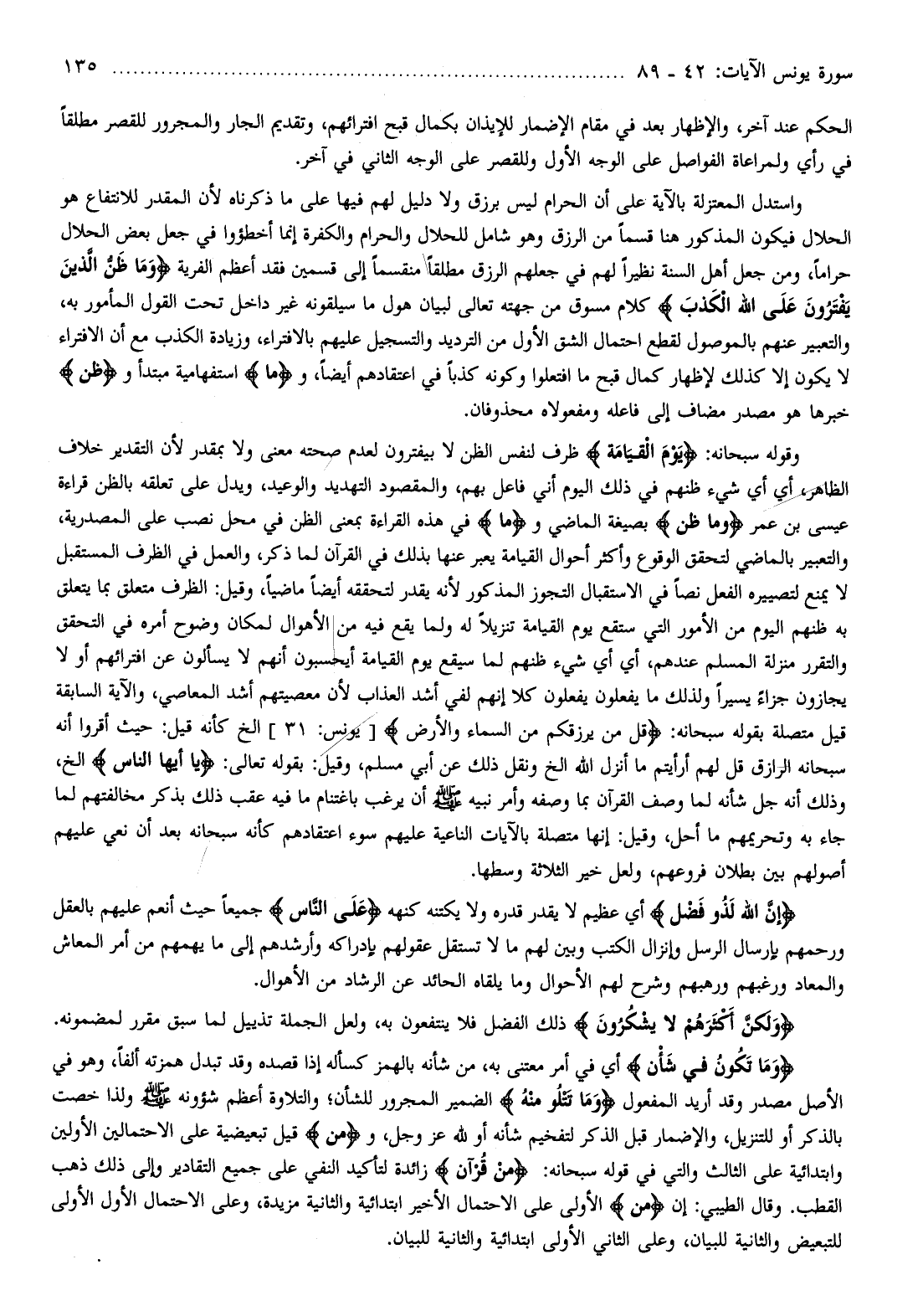 وقوله سبحانه: يَوْمَ الْقِيامَةِ ظرف لنفس الظن لا بيفترون لعدم صحته معنى ولا بمقدر لأن التقدير خلاف الظاهر، أي أي شيء ظنهم في ذلك اليوم أني فاعل بهم، والمقصود التهديد والوعيد، ويدل على تعلقه بالظن قراءة عيسى بن عمر وَما ظَنُّ بصيغة الماضي وما في هذه القراءة بمعنى الظن في محل نصب على المصدرية، والتعبير بالماضي لتحقق الوقوع وأكثر أحوال القيامة يعبر عنها بذلك في القرآن لما ذكر، والعمل في الظرف المستقبل لا يمنع لتصييره الفعل نصا في الاستقبال التجوز المذكور لأنه يقدر لتحققه أيضا ماضيا، وقيل: الظرف متعلق بما يتعلق به ظنهم اليوم من الأمور التي ستقع يوم القيامة تنزيلا له ولما يقع فيه من الأهوال لمكان وضوح أمره في التحقق والتقرر منزلة المسلم عندهم، أي أي شيء ظنهم لما سيقع يوم القيامة أيحسبون أنهم لا يسألون عن افترائهم أو لا يجازون جزاء يسيرا ولذلك ما يفعلون يفعلون كلا إنهم لفي أشد العذاب لأن معصيتهم أشد المعاصي، والآية السابقة قيل متصلة بقوله سبحانه: قُلْ مَنْ يَرْزُقُكُمْ مِنَ السَّماءِ وَالْأَرْضِ [يونس: 31] إلخ كأنه قيل: حيث أقروا أنه سبحانه الرازق قل لهم أرأيتم ما أنزل الله إلخ ونقل ذلك عن أبي مسلم، وقيل: بقوله تعالى: يا أَيُّهَا النَّاسُ إلخ، وذلك أنه جل شأنه لما وصف القرآن بما وصفه وأمر نبيه صلّى الله عليه وسلم أن يرغب باغتنام ما فيه عقب ذلك بذكر مخالفتهم لما جاء به وتحريمهم ما أحل، وقيل: إنها متصلة بالآيات الناعية عليهم سوء اعتقادهم كأنه سبحانه بعد أن نعي عليهم أصولهم بين بطلان فروعهم، ولعل خير الثلاثة وسطها.
