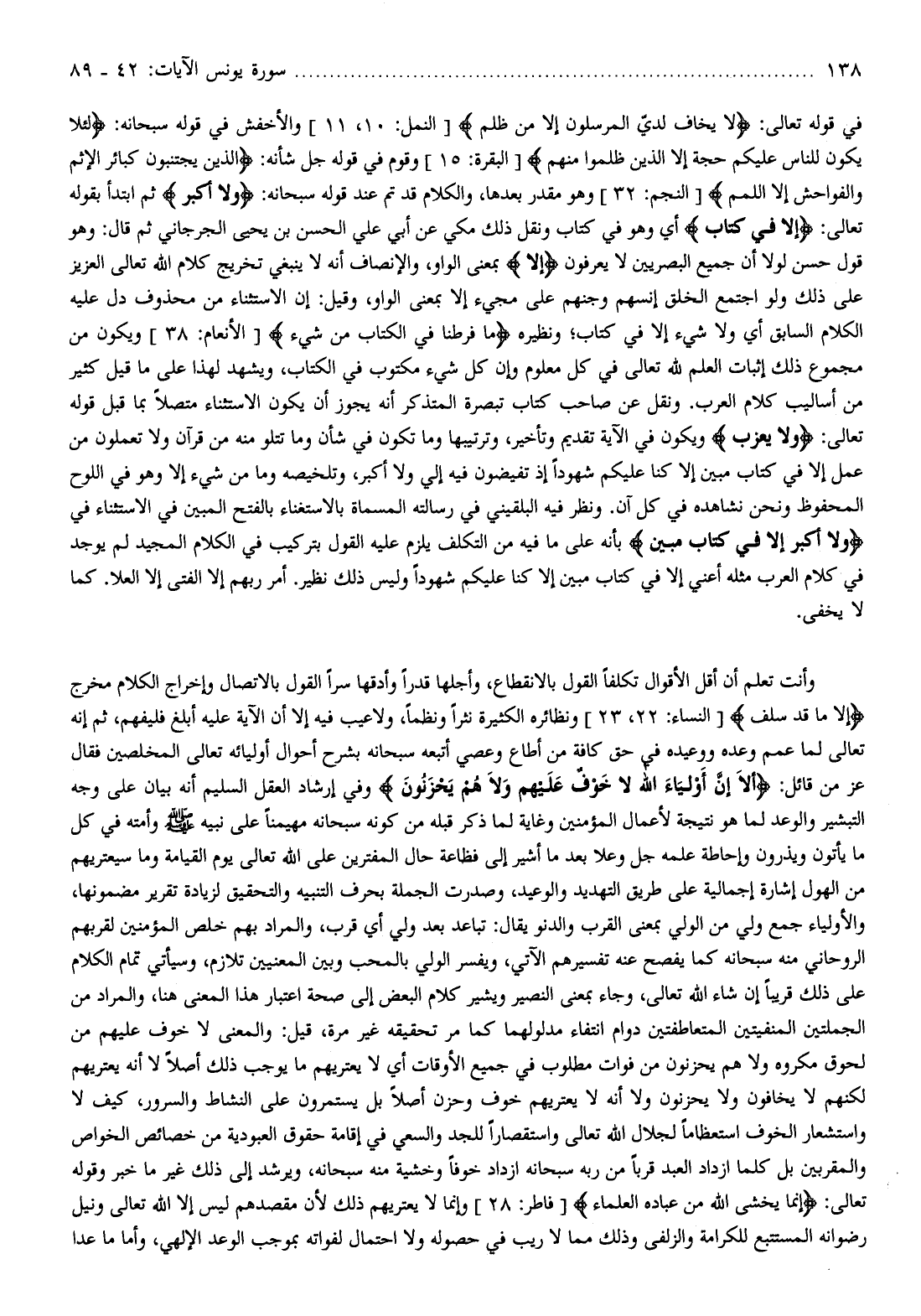 في قوله تعالى: لا يَخافُ لَدَيَّ الْمُرْسَلُونَ إِلَّا مَنْ ظَلَمَ [النمل: 10، 11] والأخفش في قوله سبحانه: لِئَلَّا يَكُونَ لِلنَّاسِ عَلَيْكُمْ حُجَّةٌ إِلَّا الَّذِينَ ظَلَمُوا مِنْهُمْ [البقرة: 15] وقوم في قوله جل شأنه: الَّذِينَ يَجْتَنِبُونَ كَبائِرَ الْإِثْمِ وَالْفَواحِشَ إِلَّا اللَّمَمَ [النجم: 32] وهو مقدر بعدها، والكلام قد تم عند قوله سبحانه: وَلا أَكْبَرَ ثم ابتدأ بقوله تعالى: إِلَّا فِي كِتابٍ أي وهو في كتاب ونقل ذلك مكي عن أبي علي الحسن بن يحيى الجرجاني ثم قال: وهو قول حسن لولا أن جميع البصريين لا يعرفون إِلَّا بمعنى الواو، والإنصاف أنه لا ينبغي تخريج كلام الله تعالى العزيز على ذلك ولو اجتمع الخلق إنسهم وجنهم على مجيء إلا بمعنى الواو، وقيل: إن الاستثناء من محذوف دل عليه الكلام السابق أي ولا شيء إلا في كتاب ونظيره ما فَرَّطْنا فِي الْكِتابِ مِنْ شَيْءٍ [الأنعام: 38] ويكون من مجموع ذلك إثبات العلم لله تعالى في كل معلوم وإن كل شيء مكتوب في الكتاب، ويشهد لهذا على ما قيل كثير من أساليب كلام العرب. ونقل عن صاحب كتاب تبصرة المتذكر أنه يجوز أن يكون الاستثناء متصلا بما قبل قوله تعالى: ولا يَعْزُبُ ويكون في الآية تقديم وتأخير، وترتيبها وما تكون في شأن وما تتلو منه من قرآن ولا تعملون من عمل إلا في كتاب مبين إلا كنا عليكم شهودا إذ تفيضون فيه إلي ولا أكبر، وتلخيصه وما من شيء إلا وهو في اللوح المحفوظ ونحن نشاهده في كل آن. ونظر فيه البلقيني في رسالته المسماة بالاستغناء بالفتح المبين في الاستثناء في وَلا أَكْبَرَ إِلَّا فِي كِتابٍ مُبِينٍ بأنه على ما فيه من التكلف يلزم عليه القول بتركيب في الكلام المجيد لم يوجد في كلام العرب مثله أعني إلا في كتاب مبين إلا كنا عليكم شهودا وليس ذلك نظير. أمر ربهم إلا الفتى إلا العلا. كما لا يخفى.