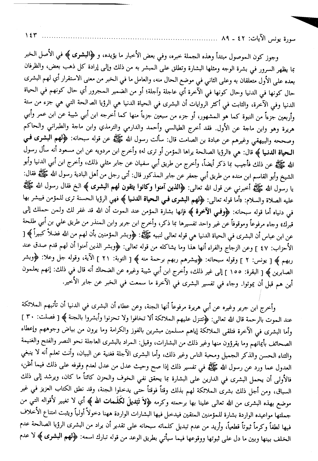 وجاء مرفوعا وموقوفا عن غير واحد تفسيرها بما ذكر، وأخرج ابن جرير وابن المنذر من طريق علي بن أبي طلحة عن ابن عباس أن البشرى في الحياة الدنيا هي قوله تعالى لنبيه صلّى الله عليه وسلم: وَبَشِّرِ الْمُؤْمِنِينَ بِأَنَّ لَهُمْ مِنَ اللَّهِ فَضْلًا كَبِيراً [الأحزاب: 47] وعن الزجاج والفراء أنها هذا وما يشاكله من قوله تعالى: وَبَشِّرِ الَّذِينَ آمَنُوا أَنَّ لَهُمْ قَدَمَ صِدْقٍ عِنْدَ رَبِّهِمْ [يونس: 2] وقوله سبحانه: يُبَشِّرُهُمْ رَبُّهُمْ بِرَحْمَةٍ مِنْهُ [التوبة: 21] الآية، وقوله جل وعلا: وَبَشِّرِ الصَّابِرِينَ [البقرة: 155] إلى غير ذلك، وأخرج ابن أبي شيبة وغيره عن الضحاك أنه قال في ذلك: إنهم يعلمون أين هم قبل أن يموتوا. وجاء في تفسير البشرى في الآخرة ما سمعت في الخبر عن جابر الأخير.