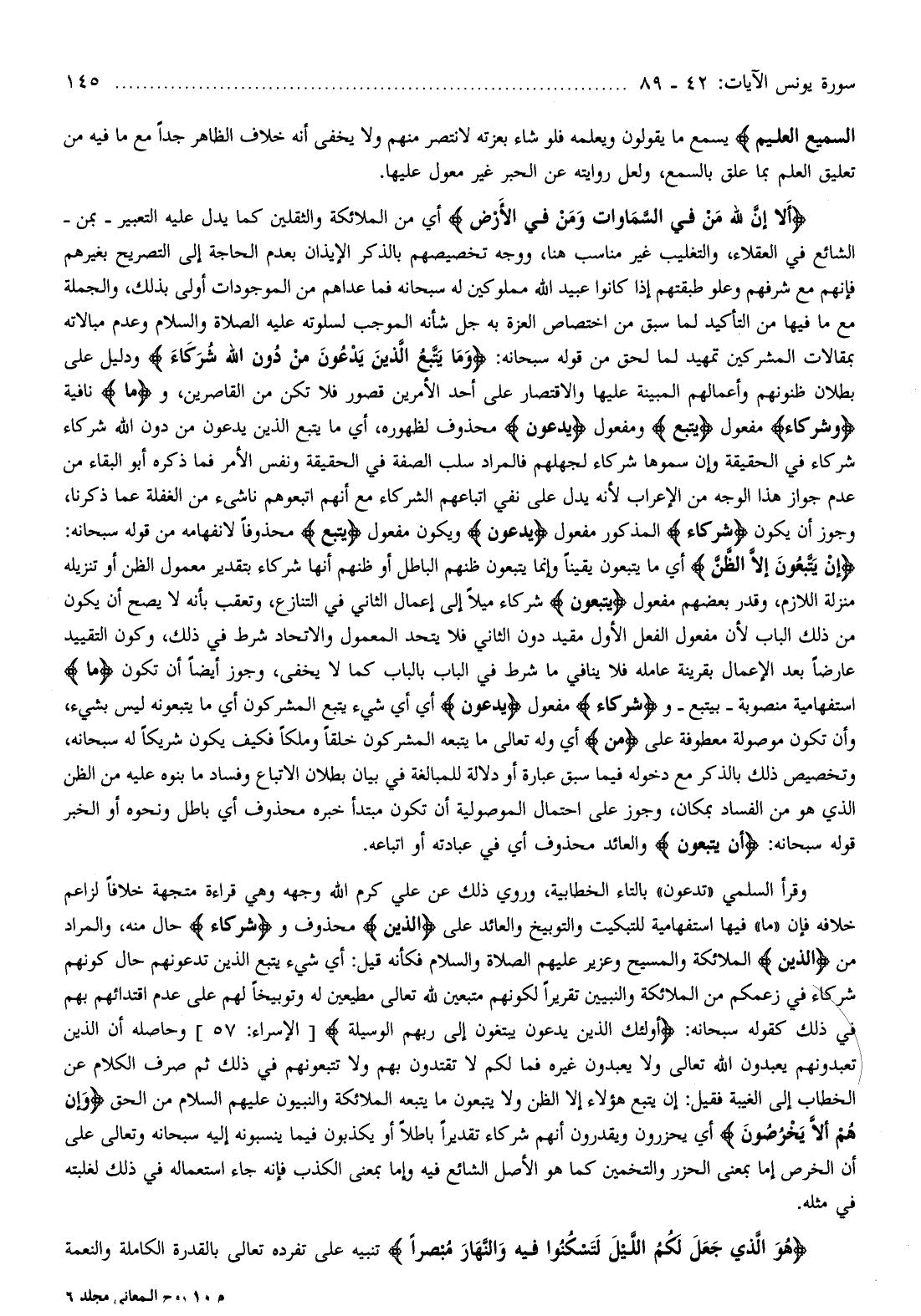 أَلا إِنَّ لِلَّهِ مَنْ فِي السَّماواتِ وَمَنْ فِي الْأَرْضِ أي من الملائكة والثقلين كما يدل عليه التعبير- بمن- الشائع في العقلاء، والتغليب غير مناسب هنا، ووجه تخصيصهم بالذكر الإيذان بعدم الحاجة إلى التصريح بغيرهم فإنهم مع شرفهم وعلو طبقتهم إذا كانوا عبيد الله مملوكين له سبحانه فما عداهم من الموجودات أولى بذلك، والجملة مع ما فيها من التأكيد لما سبق من اختصاص العزة به جل شأنه الموجب لسلوته عليه الصلاة والسلام وعدم مبالاته بمقالات المشركين تمهيد لما لحق من قوله سبحانه: وَما يَتَّبِعُ الَّذِينَ يَدْعُونَ مِنْ دُونِ اللَّهِ شُرَكاءَ ودليل على بطلان ظنونهم وأعمالهم المبينة عليها والاقتصار على أحد الأمرين قصور فلا تكن من القاصرين، وما نافية وشُرَكاءَ مفعول يَتَّبِعُ ومفعول يَدْعُونَ محذوف لظهوره، أي ما يتبع الذين يدعون من دون الله شركاء شركاء في الحقيقة وإن سموها شركاء لجهلهم فالمراد سلب الصفة في الحقيقة ونفس الأمر فما ذكره أبو البقاء من عدم جواز هذا الوجه من الإعراب لأنه يدل على نفي اتباعهم الشركاء مع أنهم اتبعوهم ناشىء من الغفلة عما ذكرنا، وجوز أن يكون شُرَكاءَ المذكور مفعول يَدْعُونَ ويكون مفعول يَتَّبِعُ محذوفا لانفهامه من قوله سبحانه: