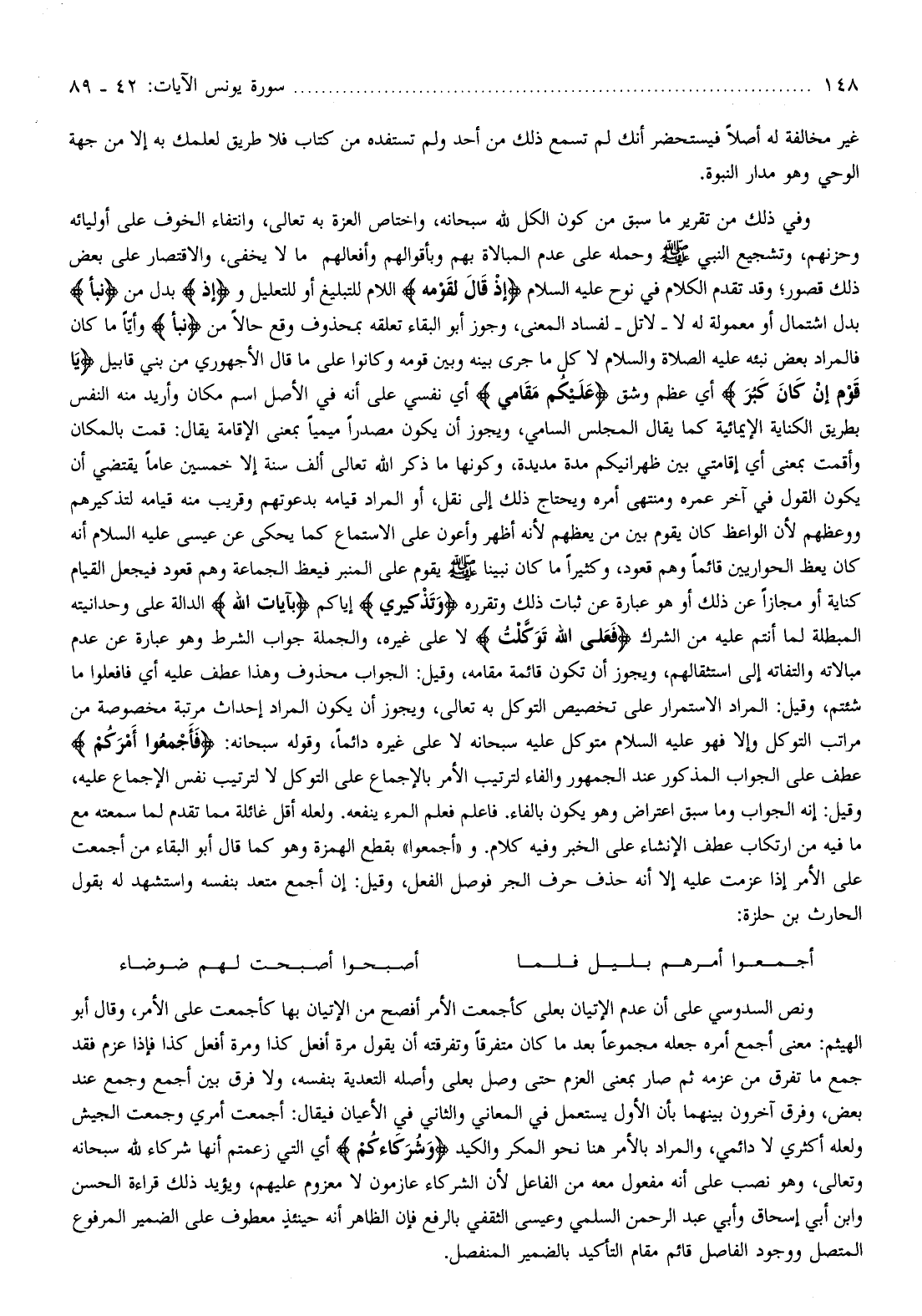 وفي ذلك من تقرير ما سبق من كون الكل لله سبحانه، واختصاص؟؟؟ العزة به تعالى، وانتفاء الخوف على أوليائه وحزنهم، وتشجيع النبي صلّى الله عليه وسلم وحمله على عدم المبالاة بهم وبأقوالهم وأفعالهم ما لا يخفى، والاقتصار على بعض ذلك قصور وقد تقدم الكلام في نوح عليه السلام إِذْ قالَ لِقَوْمِهِ اللام للتبليغ أو للتعليل وإِذْ بدل من نَبَأَ بدل اشتمال أو معمولة له لا- لاتل- لفساد المعنى، وجوز أبو البقاء تعلقه بمحذوف وقع حالا من نَبَأَ وأيّا ما كان فالمراد بعض نبئه عليه الصلاة والسلام لا كل ما جرى بينه وبين قومه وكانوا على ما قال الأجهوري من بني قابيل يا قَوْمِ إِنْ كانَ كَبُرَ أي عظم وشق عَلَيْكُمْ مَقامِي أي نفسي على أنه في الأصل اسم مكان وأريد منه النفس بطريق الكناية الإيمائية كما يقال المجلس السامي، ويجوز أن يكون مصدرا ميميا بمعنى الإقامة يقال: قمت بالمكان وأقمت بمعنى أي إقامتي بين ظهرانيكم مدة مديدة، وكونها ما ذكر الله تعالى ألف سنة إلا خمسين عاما يقتضي أن يكون القول في آخر عمره ومنتهى أمره ويحتاج ذلك إلى نقل، أو المراد قيامه بدعوتهم وقريب منه قيامه لتذكيرهم ووعظهم لأن الواعظ كان يقوم بين من يعظهم لأنه أظهر وأعون على الاستماع كما يحكى عن عيسى عليه السلام أنه كان يعظ الحواريين قائما وهم قعود، وكثيرا ما كان نبينا صلّى الله عليه وسلم يقوم على المنبر فيعظ الجماعة وهم قعود فيجعل القيام كناية أو مجازا عن ذلك أو هو عبارة عن ثبات ذلك وتقرره وَتَذْكِيرِي إياكم بِآياتِ اللَّهِ الدالة على وحدانيته المبطلة لما أنتم عليه من الشرك فَعَلَى اللَّهِ تَوَكَّلْتُ لا على غيره، والجملة جواب الشرط وهو عبارة عن عدم مبالاته والتفاته إلى استثقالهم، ويجوز أن تكون قائمة مقامه، وقيل: الجواب محذوف وهذا عطف عليه أي فافعلوا ما شئتم، وقيل: المراد الاستمرار على تخصيص التوكل به تعالى، ويجوز أن يكون المراد إحداث مرتبة مخصوصة من مراتب التوكل وإلا فهو عليه السلام متوكل عليه سبحانه لا على غيره دائما، وقوله سبحانه: فَأَجْمِعُوا أَمْرَكُمْ عطف على الجواب المذكور عند الجمهور والفاء لترتيب الأمر بالإجماع على التوكل لا لترتيب نفس الإجماع عليه، وقيل: إنه الجواب وما سبق اعتراض وهو يكون بالفاء. فاعلم فعلم المرء ينفعه. ولعله أقل غائلة مما تقدم لما سمعته مع ما فيه من ارتكاب عطف الإنشاء على الخبر وفيه كلام. و «أجمعوا» بقطع الهمزة وهو كما قال أبو البقاء من أجمعت على الأمر إذا عزمت عليه إلا أنه حذف حرف الجر فوصل الفعل، وقيل: إن أجمع متعد بنفسه واستشهد له بقول الحارث بن حلزة: