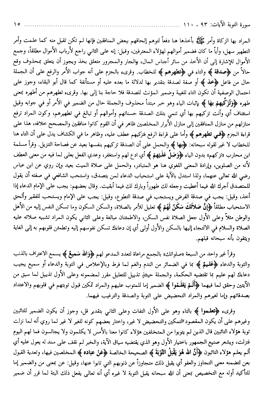 المراد بها الزكاة وأمر صلّى الله عليه وسلم بأخذها هنا دفعا لتوهم إلحاقهم ببعض المنافقين فإنها لم تكن تقبل منه كما علمت وأمر التطهير سهل، وأيا ما كان فضمير أموالهم لهؤلاء المعترفين، وقيل: إنه على الثاني راجع لأرباب الأموال مطلقا، وجمع الأموال للإشارة إلى أن الأخذ من سائر أجناس المال، والجار والمجرور متعلق بخذ ويجوز أن يتعلق بمحذوف وقع حالا من صَدَقَةً والتاء في تُطَهِّرُهُمْ للخطاب. وقرىء بالجزم على أنه جواب الأمر والرفع على أن الجملة حال من فاعل خُذْ أو صفة لصدقة بتقدير بها لدلالة ما بعده عليه أو مستأنفة كما قال أبو البقاء، وجوز على احتمال الوصفية أن تكون التاء للغيبة وضمير المؤنث للصدقة فلا حاجة بنا إلى بها. وقرىء تطهرهم من أطهره بمعنى طهره وَتُزَكِّيهِمْ بِها بإثبات الياء وهو خبر مبتدأ محذوف والجملة حال من الضمير في الأمر أو في جوابه وقيل استئناف أي وأنت تزكيهم بها أي تنمي بتلك الصدقة حسناتهم وأموالهم أو تبالغ في تطهيرهم، وكون المراد ترفع منازلهم من منازل المنافقين إلى منازل الأبرار المخلصين ظاهر في أن القوم كانوا منافقين والمصحح خلافه، هذا على قراءة الجزم في تُطَهِّرُهُمْ وأما على قراءة الرفع فتزكيهم عطف عليه، وظاهر ما في الكشاف يدل على أن التاء هنا للخطاب لا غير لقوله سبحانه: بِها والحمل على أن الصدقة تزكيهم بنفسها بعيد عن فصاحة التنزيل. وقرأ مسلمة ابن محارب «تزكهم» بدون الياء وَصَلِّ عَلَيْهِمْ أي ادع لهم واستغفر، وعدي الفعل بعلى لما فيه من معنى العطف لأنه من الصلوين، وإرادة المعنى اللغوي هنا هو المتبادر، والحمل على صلاة الميت بعيد وإن روي عن ابن عباس رضي الله تعالى عنهما، ولذا استدل بالآية على استحباب الدعاء لمن يتصدق، واستحب الشافعي في صفته أن يقول للمتصدق آجرك الله فيما أعطيت وجعله لك طهورا وبارك لك فيما أبقيت. وقال بعضهم: يجب على الإمام الدعاء إذا أخذ، وقيل: يجب في صدقة الفرض ويستجب في صدقة التطوع، وقيل: يجب على الإمام ويستحب للفقير وألحق الاستحباب مطلقا إِنَّ صَلاتَكَ سَكَنٌ لَهُمْ تعليل للأمر بالصلاة، والسكن السكون وما تسكن النفس إليه من الأهل والوطن مثلا وعلى الأول جعل الصلاة نفس السكن، والاطمئنان مبالغة وعلى الثاني يكون المراد تشبيه صلاته عليه الصلاة والسلام في الالتجاء إليها بالسكن والأول أولى أي إن دعاءك تسكن نفوسهم إليه وتطمئن قلوبهم به إلى الغاية ويثقون بأنه سبحانه قبلهم.