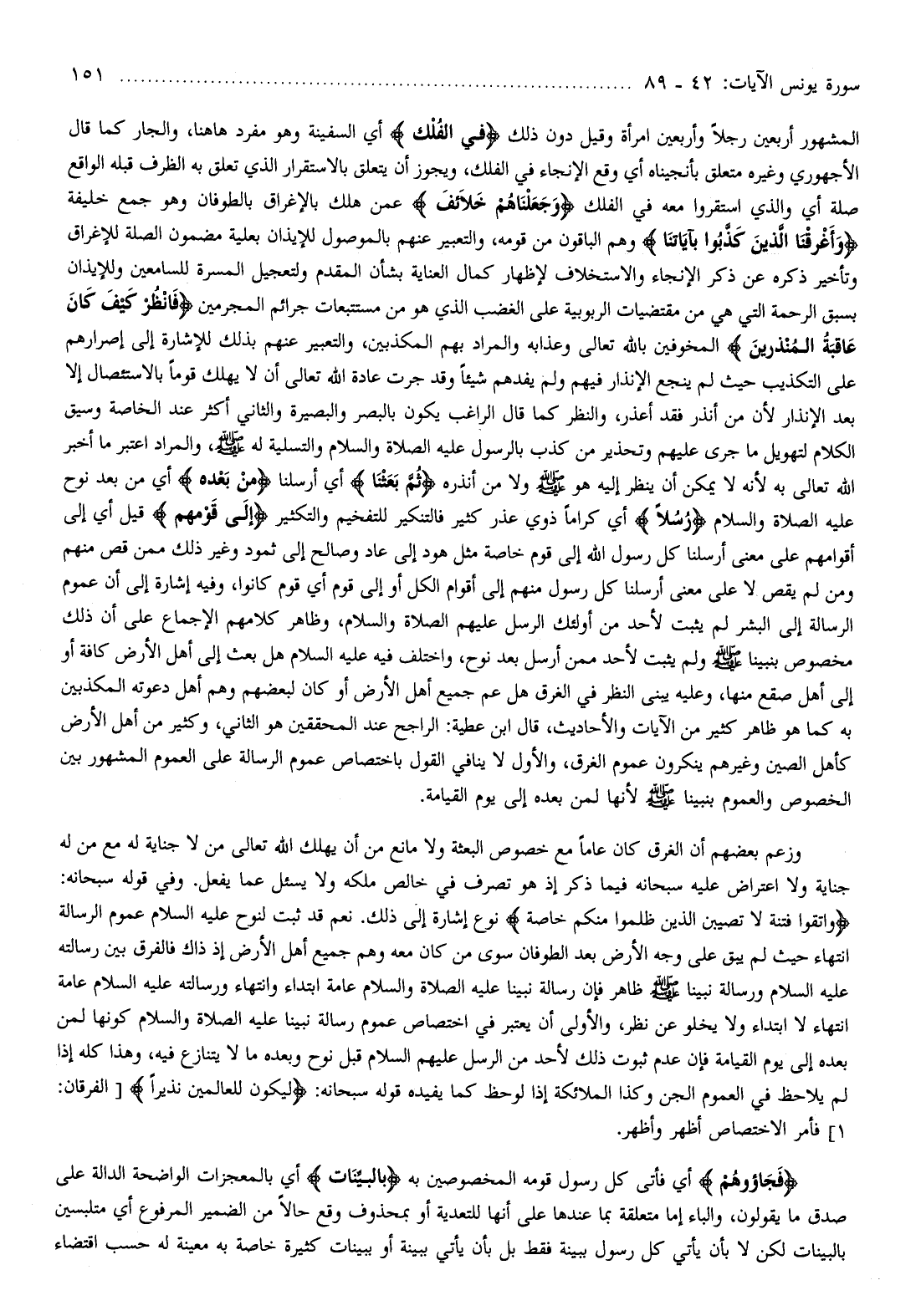 المشهور أربعين رجلا وأربعين امرأة وقيل دون ذلك فِي الْفُلْكِ أي السفينة وهو مفرد هاهنا والجار كما قال الأجهوري وغيره متعلق بأنجيناه أي وقع الإنجاء في الفلك، ويجوز أن يتعلق بالاستقرار الذي تعلق به الظرف قبله الواقع صلة أي والذي استقروا معه في الفلك وَجَعَلْناهُمْ خَلائِفَ عمن هلك بالإغراق بالطوفان وهو جمع خليفة وَأَغْرَقْنَا الَّذِينَ كَذَّبُوا بِآياتِنا وهم الباقون من قومه، والتعبير عنهم بالموصول للإيذان بعلية مضمون الصلة للإغراق وتأخير ذكره عن ذكر الإنجاء والاستخلاف لإظهار كمال العناية بشأن المقدم ولتعجيل المسرة للسامعين وللإيذان بسبق الرحمة التي هي من مقتضيات الربوبية على الغضب الذي هو من مستتبعات جرائم المجرمين فَانْظُرْ كَيْفَ كانَ عاقِبَةُ الْمُنْذَرِينَ المخوفين بالله تعالى وعذابه والمراد بهم المكذبين، والتعبير عنهم بذلك للإشارة إلى إصرارهم على التكذيب حيث لم ينجع الإنذار فيهم ولم يفدهم شيئا وقد جرت عادة الله تعالى أن لا يهلك قوما بالاستئصال إلا بعد الإنذار لأن من أنذر فقد أعذر، والنظر كما قال الراغب يكون بالبصر والبصيرة والثاني أكثر عند الخاصة وسيق الكلام لتهويل ما جرى عليهم وتحذير من كذب بالرسول عليه الصلاة والسلام والتسلية له صلّى الله عليه وسلم، والمراد اعتبر ما أخبر الله تعالى به لأنه لا يمكن أن ينظر إليه هو صلّى الله عليه وسلم ولا من أنذره ثُمَّ بَعَثْنا أي أرسلنا مِنْ بَعْدِهِ أي من بعد نوح عليه الصلاة والسلام رُسُلًا أي كراما ذوي عذر كثير فالتنكير للتفخيم والتكثير إِلى قَوْمِهِمْ قيل أي إلى أقوامهم على معنى أرسلنا كل رسول الله إلى قوم خاصة مثل هود إلى عاد وصالح إلى ثمود وغير ذلك ممن قص منهم ومن لم يقص لا على معنى أرسلنا كل رسول منهم إلى أقوام الكل أو إلى قوم أي قوم كانوا، وفيه إشارة إلى أن عموم الرسالة إلى البشر لم يثبت لأحد من أولئك الرسل عليهم الصلاة والسلام، وظاهر كلامهم الإجماع على أن ذلك مخصوص بنبينا صلّى الله عليه وسلم ولم يثبت لأحد ممن أرسل بعد نوح، واختلف فيه عليه السلام هل بعث إلى أهل الأرض كافة أو إلى أهل صقع منها، وعليه يبنى النظر في الغرق هل عم جميع أهل الأرض أو كان لبعضهم وهم أهل دعوته المكذبين به كما هو ظاهر كثير من الآيات والأحاديث، قال ابن عطية: الراجح عند المحققين هو الثاني، وكثير من أهل الأرض كأهل الصين وغيرهم ينكرون عموم الغرق، والأول لا ينافي القول باختصاص عموم الرسالة على العموم المشهور بين الخصوص والعموم بنبينا صلّى الله عليه وسلم لأنها لمن بعده إلى يوم القيامة.