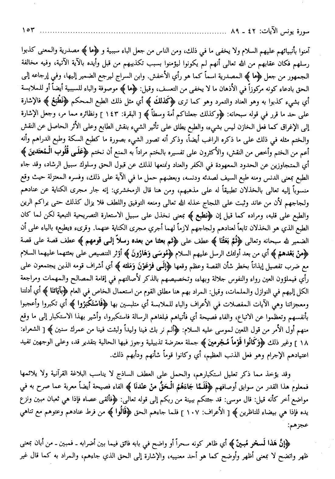 آمنوا بأنبيائهم عليهم السلام ولا يخفى ما في ذلك، ومن الناس من جعل الباء سببية وما مصدرية والمعنى كذبوا رسلهم فكان عقابهم من الله تعالى أنهم لم يكونوا ليؤمنوا بسبب تكذيبهم من قبل وأيده بالآية الآتية، وفيه مخالفة الجمهور من جعل ما المصدرية اسما كما هو رأي الأخفش. وابن السراج ليرجع الضمير إليها، وفي إرجاعه إلى الحق بادعاء كونه مركوزا في الأذهان ما لا يخفى من التعسف، وقيل: ما موصوفة والباء للسببية أيضا أو للملابسة أي بشيء كذبوا به وهو العناد والتمرد وهو كما ترى كَذلِكَ أي مثل ذلك الطبع المحكم نَطْبَعُ فالإشارة على حد ما قرر في قوله سبحانه: وَكَذلِكَ جَعَلْناكُمْ أُمَّةً وَسَطاً [البقرة: 143] ونظائره مما مر، وجعل الإشارة إلى الإغراق كما فعل الخازن ليس بشيء، والطبع يطلق على تأثير الشيء بنقش الطابع وعلى الأثر الحاصل عن النقش والختم مثله في ذلك على ما ذكره الراغب أيضا، وذكر أنه تصور الشيء بصورة ما كطبع السكة وطبع الدراهم وأنه أعم من الختم وأخص من النقش، والأكثرون على تفسيره بالختم مرادا به المنع أن نختم عَلى قُلُوبِ الْمُعْتَدِينَ أي المتجاوزين عن الحدود المعهودة في الكفر والعناد ونمنعها لذلك عن قبول الحق وسلوك سبيل الرشاد، وقد جاء الطبع بمعنى الدنس ومنه طبع السيف لصدئه ودنسه، وبعضهم حمل ما في الآية على ذلك، وفسره المعتزلة حيث وقع منسوبا إليه تعالى بالخذلان تطبيقا له على مذهبهم، ومن هنا قال الزمخشري: إنه جار مجرى الكناية عن عنادهم ولجاجهم لأن من عاند وثبت على اللجاج خذله الله تعالى ومنه التوفيق واللطف فلا يزال كذلك حتى يراكم الرين والطبع على قلبه، ومراده كما قيل إن نَطْبَعُ بمعنى نخذل على سبيل الاستعارة التصريحية التبعية لكن لما كان الطبع الذي هو الخذلان تابعا لعنادهم ولجاجهم لازما لهما أجري مجرى الكناية عنهما. وقرىء «يطبع» بالياء على أن الضمير لله سبحانه وتعالى ثُمَّ بَعَثْنا عطف على ثُمَّ بَعَثْنا مِنْ بَعْدِهِ رُسُلًا إِلى قَوْمِهِمْ عطف قصة على قصة مِنْ بَعْدِهِمْ أي من بعد أولئك الرسل عليهم السلام مُوسى وَهارُونَ أؤثر التنصيص على بعثتهما عليهما السلام مع ضرب تفصيل إيذانا بخطر شأن القصة وعظم وقعها إِلى فِرْعَوْنَ وَمَلَائِهِ أي أشراف قومه الذين يجتمعون على رأي فيملؤون العين رواء والنفوس جلالة وبهاء، وتخصيصهم بالذكر لأصالتهم في إقامة المصالح والمهمات ومراجعة الكل إليهم في النوازل والملمات، وقيل: المراد بهم هنا مطلق القوم من استعمال الخاص في العام بِآياتِنا أي أدلتنا ومعجزاتنا وهي الآيات المفصلات في الأعراف والباء للملابسة أي متلبسين بها فَاسْتَكْبَرُوا أي تكبروا وأعجبوا بأنفسهم وتعظموا عن الاتباع، والفاء فصيحة أي فأتياهم فبلغاهم الرسالة فاستكبروا، وأشير بهذا الاستكبار إلى ما وقع منهم أول الأمر من قول اللعين لموسى عليه السلام: أَلَمْ نُرَبِّكَ فِينا وَلِيداً وَلَبِثْتَ فِينا مِنْ عُمُرِكَ سِنِينَ [الشعراء: