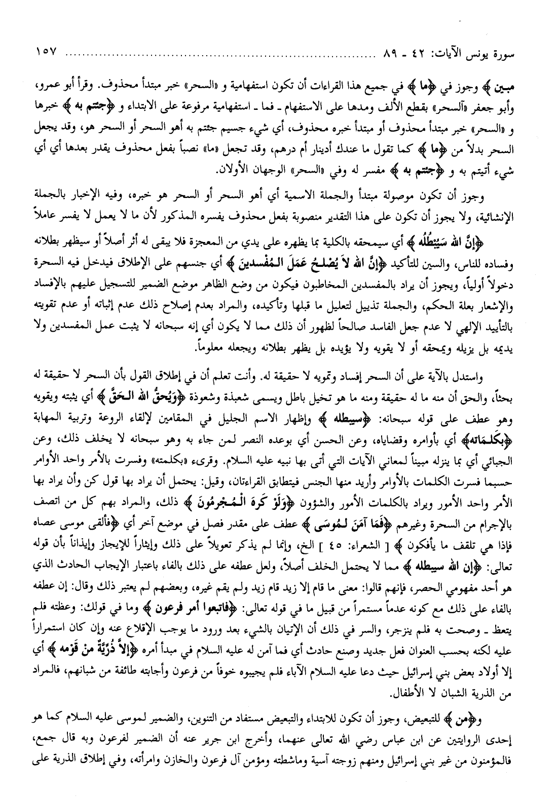 وجوز أن تكون موصولة مبتدأ والجملة الاسمية أي أهو السحر أو السحر هو خبره، وفيه الإخبار بالجملة الإنشائية، ولا يجوز أن تكون على هذا التقدير منصوبة بفعل محذوف يفسره المذكور لأن ما لا يعمل لا يفسر عاملا إِنَّ اللَّهَ سَيُبْطِلُهُ أي سيمحقه بالكلية بما يظهره على يدي من المعجزة فلا يبقى له أثر أصلا أو سيظهر بطلانه وفساده للناس، والسين للتأكيد إِنَّ اللَّهَ لا يُصْلِحُ عَمَلَ الْمُفْسِدِينَ أي جنسهم على الإطلاق فيدخل فيه السحرة دخولا أولياء، ويجوز أن يراد بالمفسدين المخاطبون فيكون من وضع الظاهر موضع الضمير للتسجيل عليهم بالإفساد والإشعار بعلة الحكم، والجملة تذييل لتعليل ما قبلها وتأكيده، والمراد بعدم إصلاح ذلك عدم إثباته أو عدم تقويته بالتأييد الإلهي لا عدم جعل الفاسد صالحا لظهور أن ذلك مما لا يكون أي إنه سبحانه لا يثبت عمل المفسدين ولا يديمه بل يزيله ويمحقه أو لا يقويه ولا يؤيده بل يظهر بطلانه ويجعله معلوما.