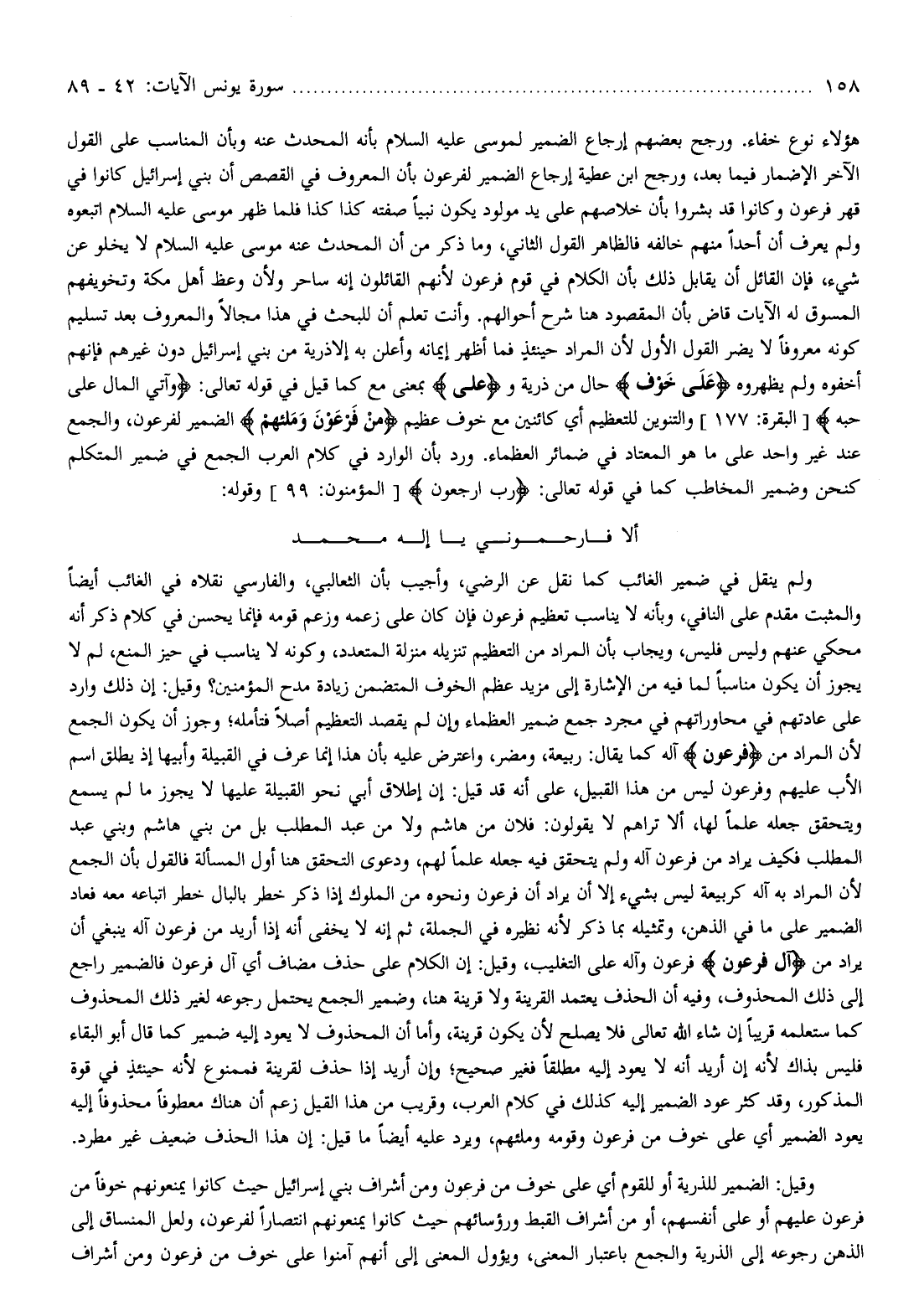 ألا فارحموني يا إله محمد ولم ينقل في ضمير الغائب كما نقل عن الرضي، وأجيب بأن الثعالبي، والفارسي نقلاه في الغائب أيضا والمثبت مقدم على النافي، وبأنه لا يناسب تعظيم فرعون فإن كان على زعمه وزعم قومه فإنما يحسن في كلام ذكر أنه محكي عنهم وليس فليس، ويجاب بأن المراد من التعظيم تنزيله منزلة المتعدد، وكونه لا يناسب في حيز المنع، لم لا يجوز أن يكون مناسبا لما فيه من الإشارة إلى مزيد عظم الخوف المتضمن زيادة مدح المؤمنين؟ وقيل: إن ذلك وارد على عادتهم في محاوراتهم في مجرد جمع ضمير العظماء وإن لم يقصد التعظيم أصلا فتأمله وجوز أن يكون الجمع لأن المراد من فِرْعَوْنَ آله كما يقال: ربيعة، ومضر، واعترض عليه بأن هذا إنما عرف في القبيلة وأبيها إذ يطلق اسم الأب عليهم وفرعون ليس من هذا القبيل، على أنه قد قيل: إن إطلاق أبي نحو القبيلة عليها لا يجوز ما لم يسمع ويتحقق جعله علما لها، ألا تراهم لا يقولون: فلان من هاشم ولا من عبد المطلب بل من بني هاشم وبني عبد المطلب فكيف يراد من فرعون آله ولم يتحقق فيه جعله علما لهم، ودعوى التحقق هنا أول المسألة فالقول بأن الجمع لأن المراد به آله كربيعة ليس بشيء إلا أن يراد أن فرعون ونحوه من الملوك إذا ذكر خطر بالبال خطر اتباعه معه فعاد الضمير على ما في الذهن، وتمثيله بما ذكر لأنه نظيره في الجملة، ثم إنه لا يخفى أنه إذا أريد من فرعون آله ينبغي أن يراد من آلِ فِرْعَوْنَ فرعون وآله على التغليب، وقيل: إن الكلام على حذف مضاف أي آل فرعون فالضمير راجع إلى ذلك المحذوف، وفيه أن الحذف يعتمد القرينة ولا قرينة هنا، وضمير الجمع يحتمل رجوعه لغير ذلك المحذوف كما ستعلمه قريبا إن شاء الله تعالى فلا يصلح لأن يكون قرينة، وأما أن المحذوف لا يعود إليه ضمير كما قال أبو البقاء فليس بذاك لأنه إن أريد أنه لا يعود إليه مطلقا فغير صحيح وإن أريد إذا حذف لقرينة فممنوع لأنه حينئذ في قوة المذكور، وقد كثر عود الضمير إليه كذلك في كلام العرب، وقريب من هذا القيل زعم أن هناك معطوفا محذوفا إليه يعود الضمير أي على خوف من فرعون وقومه وملئهم، ويرد عليه أيضا ما قيل: إن هذا الحذف ضعيف غير مطرد.