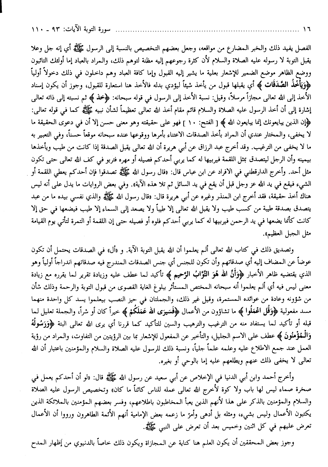 وتصديق ذلك في كتاب الله تعالى ألم يعلموا أن الله يقبل التوبة الآية. و «أل» في الصدقات يحتمل أن تكون عوضا عن المضاف إليه أي صدقاتهم وأن تكون للجنس أي جنس الصدقات المندرج فيه صدقاتهم اندراجا أوليا وهو الذي يقتضيه ظاهر الأخبار وَأَنَّ اللَّهَ هُوَ التَّوَّابُ الرَّحِيمُ تأكيد لما عطف عليه وزيادة تقرير لما يقرره مع زيادة معنى ليس فيه أي ألم يعلموا أنه سبحانه المختص المتأثر ببلوغ الغاية القصوى من قبول التوبة والرحمة وذلك شأن من شؤونه وعادة من عوائده المستمرة، وقيل غير ذلك، والجملتان في حيز النصب بيعلموا يسد كل واحدة منهما مسد مفعولية وَقُلِ اعْمَلُوا ما تشاؤون من الأعمال فَسَيَرَى اللَّهُ عَمَلَكُمْ خيرا كان أو شرا، والجملة تعليل لما قبله أو تأكيد لما يستفاد منه من الترغيب والترهيب والسين للتأكيد كما قررنا أي يرى الله تعالى البتة وَرَسُولُهُ وَالْمُؤْمِنُونَ عطف على الاسم الجليل، والتأخير عن المفعول للإشعار بما بين الرؤيتين من التفاوت، والمراد من رؤية العمل عند جمع الاطلاع عليه وعلمه علما جليا، ونسبة ذلك للرسول عليه الصلاة والسلام والمؤمنين باعتبار أن الله تعالى لا يخفى ذلك عنهم ويطلعهم عليه إما بالوحي أو بغيره.
