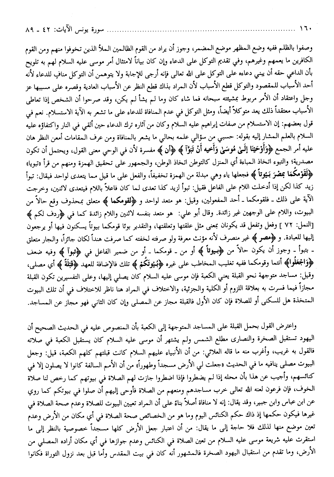 وصفوا بالظلم ففيه وضع المظهر موضع المضمر، وجوز أن يراد من القوم الظالمين الملأ الذين تخوفوا منهم ومن القوم الكافرين ما يعمهم وغيرهم، وفي تقديم التوكل على الدعاء وإن كان بيانا لامتثال أمر موسى عليه السلام لهم به تلويح بأن الداعي حقه أن يبني دعاءه على التوكل على الله تعالى فإنه أرجى للإجابة ولا يتوهمن أن التوكل مناف للدعاء لأنه أحد الأسباب للمقصود والتوكل قطع الأسباب لأن المراد بذاك قطع النظر عن الأسباب العادية وقصره على مسببها عز وجل واعتقاد أن الأمر مربوط بمشيئته سبحانه فما شاء كان وما لم يشأ لم يكن، وقد صرحوا أن الشخص إذا تعاطى الأسباب معتقدا ذلك يعد متوكلا أيضا، ومثل التوكل في عدم المنافاة للدعاء على ما تشعر به الآية الاستسلام. نعم في قول بعضهم: إن الاستسلام من صفات إبراهيم عليه السلام وكان من آثاره ترك الدعاء حين ألقي في النار واكتفاؤه عليه السلام بالعلم المشار إليه بقوله: حسبي من سؤالي علمه بحالي ما يشعر بالمنافاة ومن عرف المقامات أمعن النظر هان عليه أمر الجمع وَأَوْحَيْنا إِلى مُوسى وَأَخِيهِ أَنْ تَبَوَّءا أَنْ مفسرة لأن في الوحي معنى القول، ويحتمل أن تكون مصدرية والتبوء اتخاذ المباءة أي المنزل كالتوطن اتخاذ الوطن، والجمهور على تحقيق الهمزة ومنهم من قرأ «تبويا» لِقَوْمِكُما بِمِصْرَ بُيُوتاً فجعلها ياء وهي مبدلة من الهمزة تخفيفا، والفعل على ما قيل مما يتعدى لواحد فيقال: تبوأ زيد كذا لكن إذا أدخلت اللام على الفاعل فقيل: تبوأ لزيد كذا تعدى لما كان فاعلا باللام فيتعدى لاثنين، وخرجت الآية على ذلك- فلقومكما- أحد المفعولين، وقيل: هو متعد لواحد ولِقَوْمِكُما متعلق بمحذوف وقع حالا من البيوت، واللام على الوجهين غير زائدة. وقال أبو علي: هو متعد بنفسه لاثنين واللام زائدة كما في رَدِفَ لَكُمْ [النمل: 72] وفعل وتفعل قد يكونان بمعنى مثل علقتها وتعلقتها، والتقدير بوئا قومكما بيوتا يسكنون فيها أو يرجعون إليها للعبادة. ومصر غير منصرف لأنه مؤنث معرفة ولو صرفته لخفته كما صرفت هندا لكان جائزا، والجار متعلق- بتبوأ- وجوز أن يكون حالا من بُيُوتاً أو من- قومكما- أو من ضمير الفاعل في تَبَوَّءا وفيه ضعف وَاجْعَلُوا أنتما وقومكما ففيه تغليب المخاطب على غيره بُيُوتَكُمْ تلك فالإضافة للعهد قِبْلَةً أي مصلى، وقيل: مساجد متوجهة نحو القبلة يعني الكعبة فإن موسى عليه السلام كان يصلي إليها، وعلى التفسيرين تكون القبلة مجازا فيما فسرت به بعلاقة اللزوم أو الكلية والجزئية، والاختلاف في المراد هنا ناظر للاختلاف في أن تلك البيوت المتخذة هل للسكنى أو للصلاة فإن كان الأول فالقبلة مجاز عن المصلى وإن كان الثاني فهو مجاز عن المساجد.