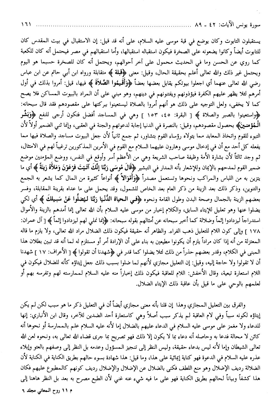 يستقبلون التابوت وكان يوضع في قبة موسى عليه السلام، على أنه قد قيل: إن الاستقبال في بيت المقدس كان للتابوت أيضا وكانوا يضعونه على الصخرة فيكون استقباله استقبالها، وأما استقبالهم في مصر فيحتمل أنه كان للكعبة كما روي عن الحسن وما في الحديث محمول على آخر أحوالهم، ويحتمل أنه كان للصخرة حسبما هو اليوم ويحتمل غير ذلك والله تعالى أعلم بحقيقة الحال، وقيل: معنى قِبْلَةً متقابلة ورواه ابن أبي حاتم عن ابن عباس رضي الله تعالى عنهما أي اجعلوا بيوتكم يقابل بعضها بعضا وَأَقِيمُوا الصَّلاةَ فيها، قيل: أمروا بذلك في أول أمرهم لئلا يظهر عليهم الكفرة فيؤذونهم ويفتنونهم في دينهم، وهو مبني على أن المراد بالبيوت المساكن فلا يصح كما لا يخفى، ولعل التوجيه على ذلك هو أنهم أمروا بالصلاة ليستعينوا ببركتها على مقصودهم فقد قال سبحانه: