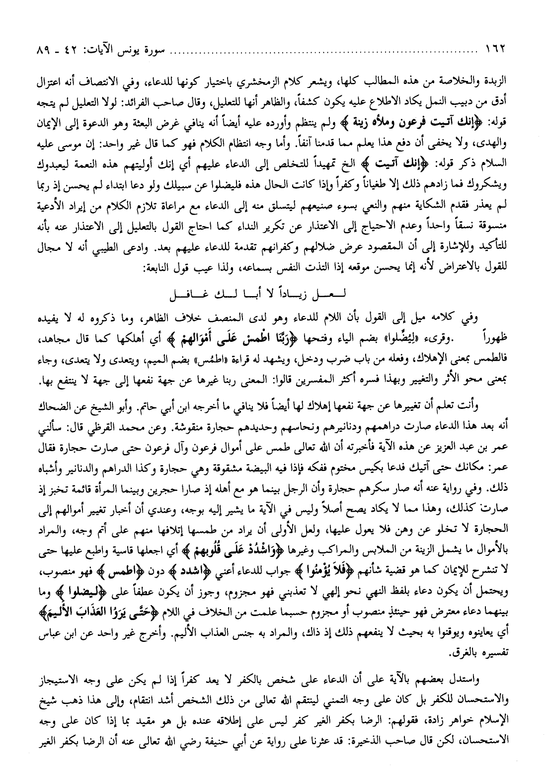 وأنت تعلم أن تغييرها عن جهة نفعها إهلاك لها أيضا فلا ينافي ما أخرجه ابن أبي حاتم. وأبو الشيخ عن الضحاك أنه بعد هذا الدعاء صارت دراهمهم ودنانيرهم ونحاسهم وحديدهم حجارة منقوشة. وعن محمد القرظي قال: سألني عمر بن عبد العزيز عن هذه الآية فأخبرته أن الله تعالى طمس على أموال فرعون وآل فرعون حتى صارت حجارة فقال عمر: مكانك حتى آتيك فدعا بكيس مختوم ففكه فإذا فيه البيضة مشقوقة وهي حجارة وكذا الدراهم والدنانير وأشباه ذلك. وفي رواية عنه أنه صار سكرهم حجارة وأن الرجل بينما هو مع أهله إذ صارا حجرين وبينما المرأة قائمة تخبز إذ صارت كذلك، وهذا مما لا يكاد يصح أصلا وليس في الآية ما يشير إليه بوجه، وعندي أن أخبار تغيير أموالهم إلى الحجارة لا تخلو عن وهن فلا يعول عليها، ولعل الأولى أن يراد من طمسها إتلافها منهم على أتم وجه، والمراد بالأموال ما يشمل الزينة من الملابس والمراكب وغيرها وَاشْدُدْ عَلى قُلُوبِهِمْ أي اجعلها قاسية واطبع عليها حتى لا تنشرح للإيمان كما هو قضية شأنهم فَلا يُؤْمِنُوا جواب للدعاء أعني اشْدُدْ دون اطْمِسْ فهو منصوب، ويحتمل أن يكون دعاء بلفظ النهي نحو إلهي لا تعذبني فهو مجزوم، وجوز أن يكون عطفا على لِيُضِلُّوا وما بينهما دعاء معترض فهو حينئذ منصوب أو مجزوم حسبما علمت من الخلاف في اللام حَتَّى يَرَوُا الْعَذابَ الْأَلِيمَ أي يعاينوه ويوقنوا به بحيث لا ينفعهم ذلك إذ ذاك، والمراد به جنس العذاب الأليم. وأخرج غير واحد عن ابن عباس تفسيره بالغرق.